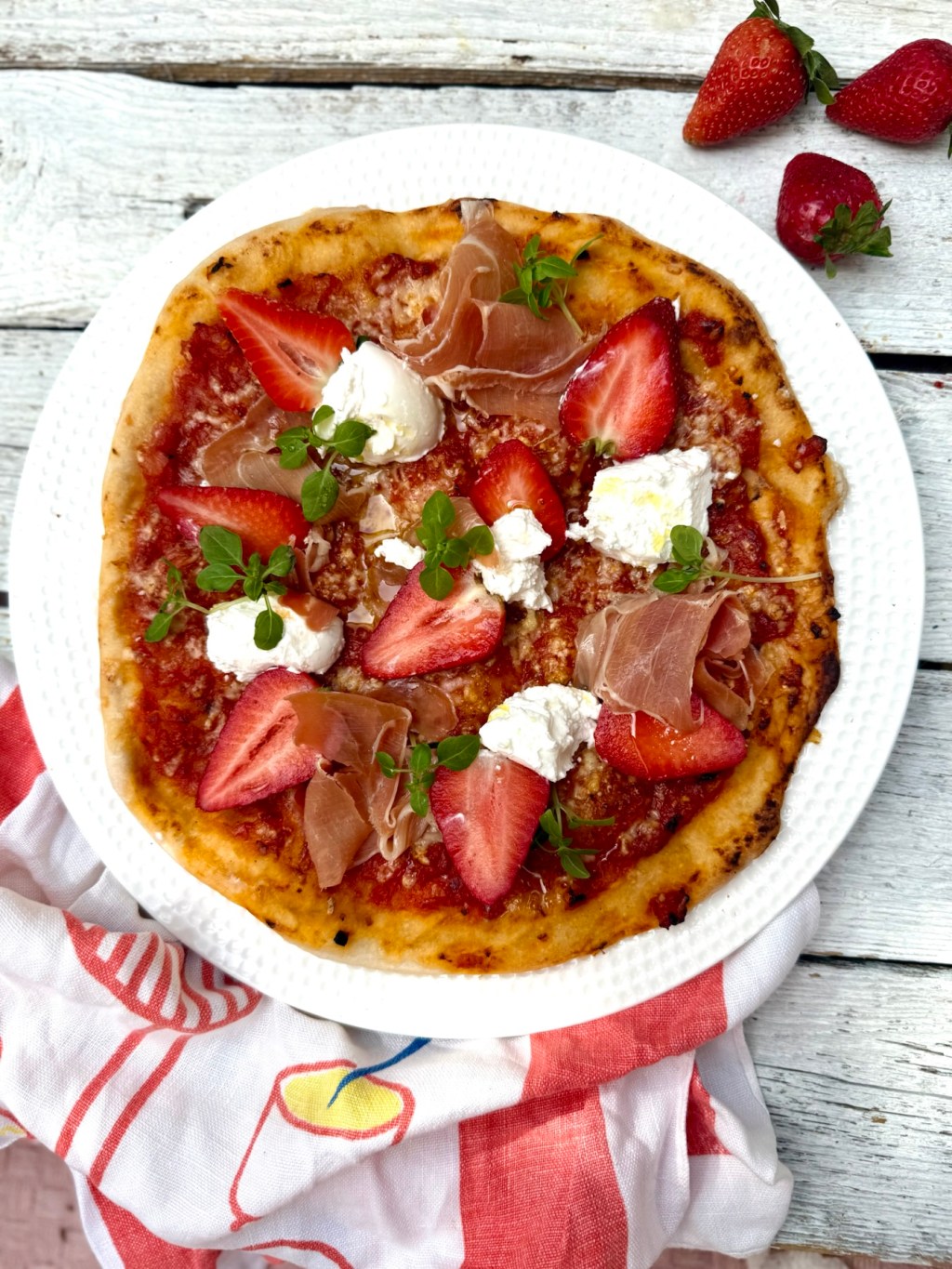 Lisää kypsän pizzan päälle ilmakuivattu kinkku , vuohenjuusto ja viipaloidut mansikat.