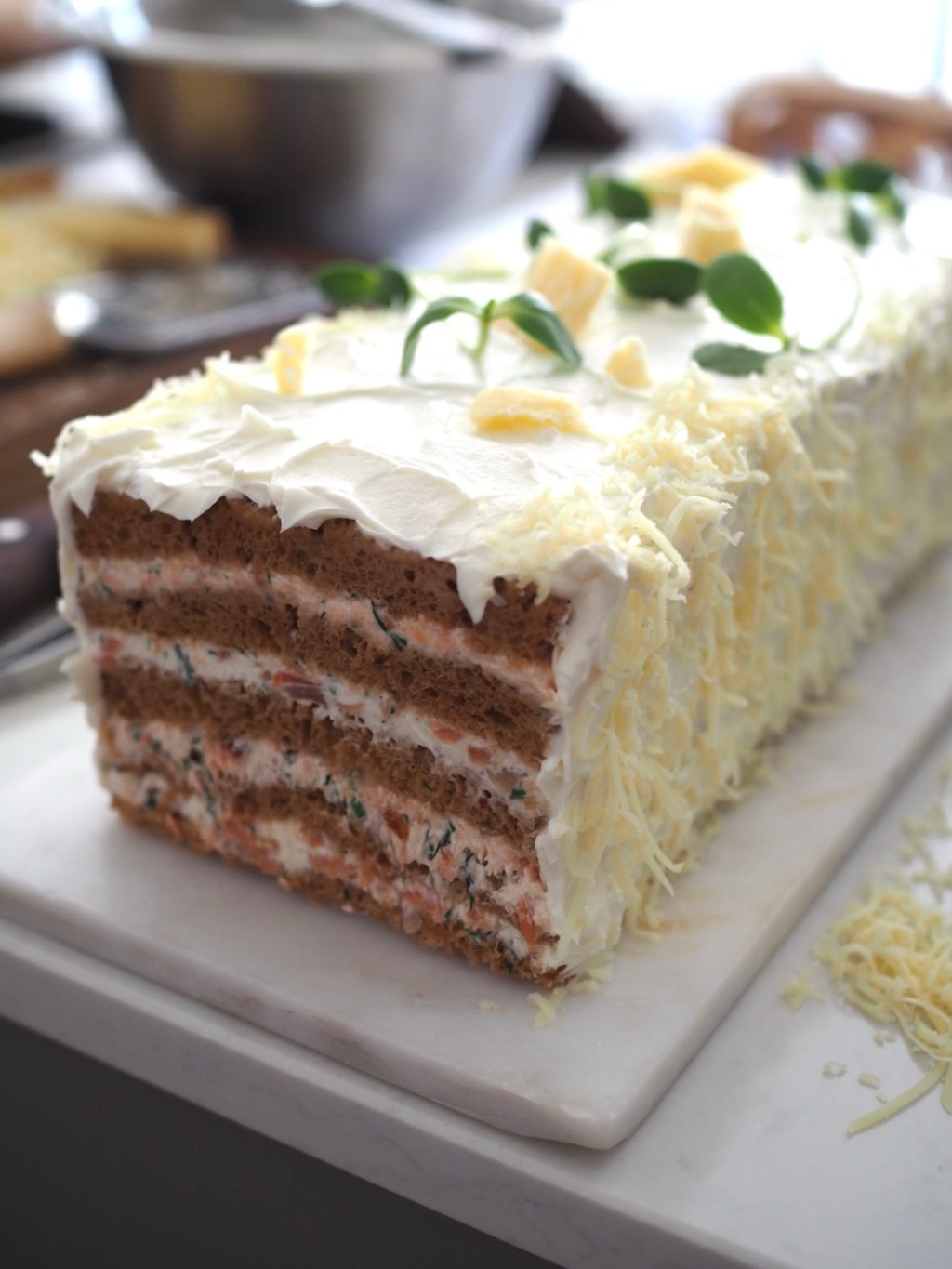 levitä leiville puolet juustotäyteestä. Jatka kunnes leipää on viisi kerrosta. Kääri kakku kostutettuun voipaperiin ja pane viileään kevyen painon alle mehustumaan seuraavaan päivään.