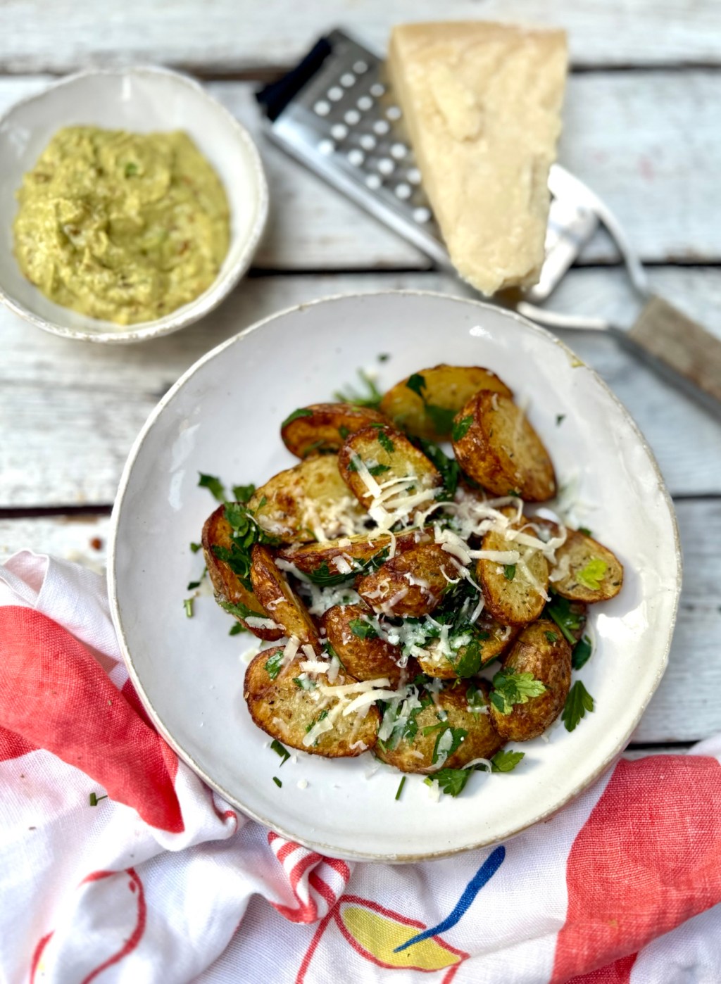 Pane kypsäksi paahdetut perunat kuumina tarjoiluastiaan. Ripottele päälle parmesania ja lehtipersiljaa. Tarjoa heti avokadodipin kanssa.
