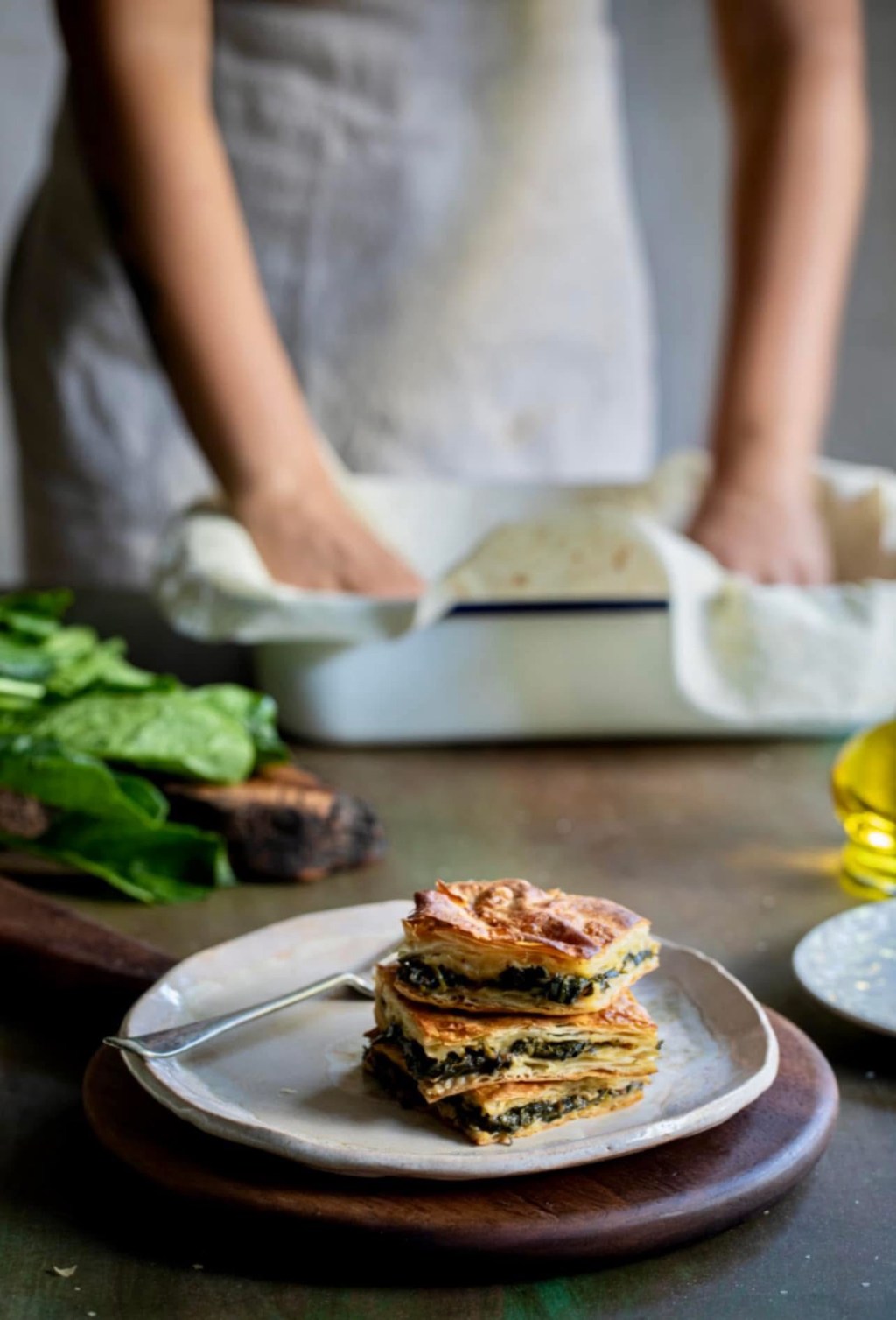 VINKKI! Yufka-levyjä kuuluu rypistellä kevyesti ladontavaiheessa. Näin levyt eivät tartu toisiinsa ja piiras pääsee kohoamaan paremmin uunissa.