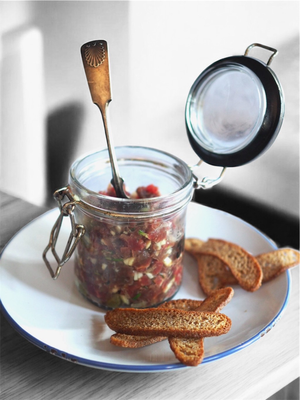 Lisää hakattu liha seokseen. Tarjoa tartar purkista tai muotoile pieniksi pihveiksi.