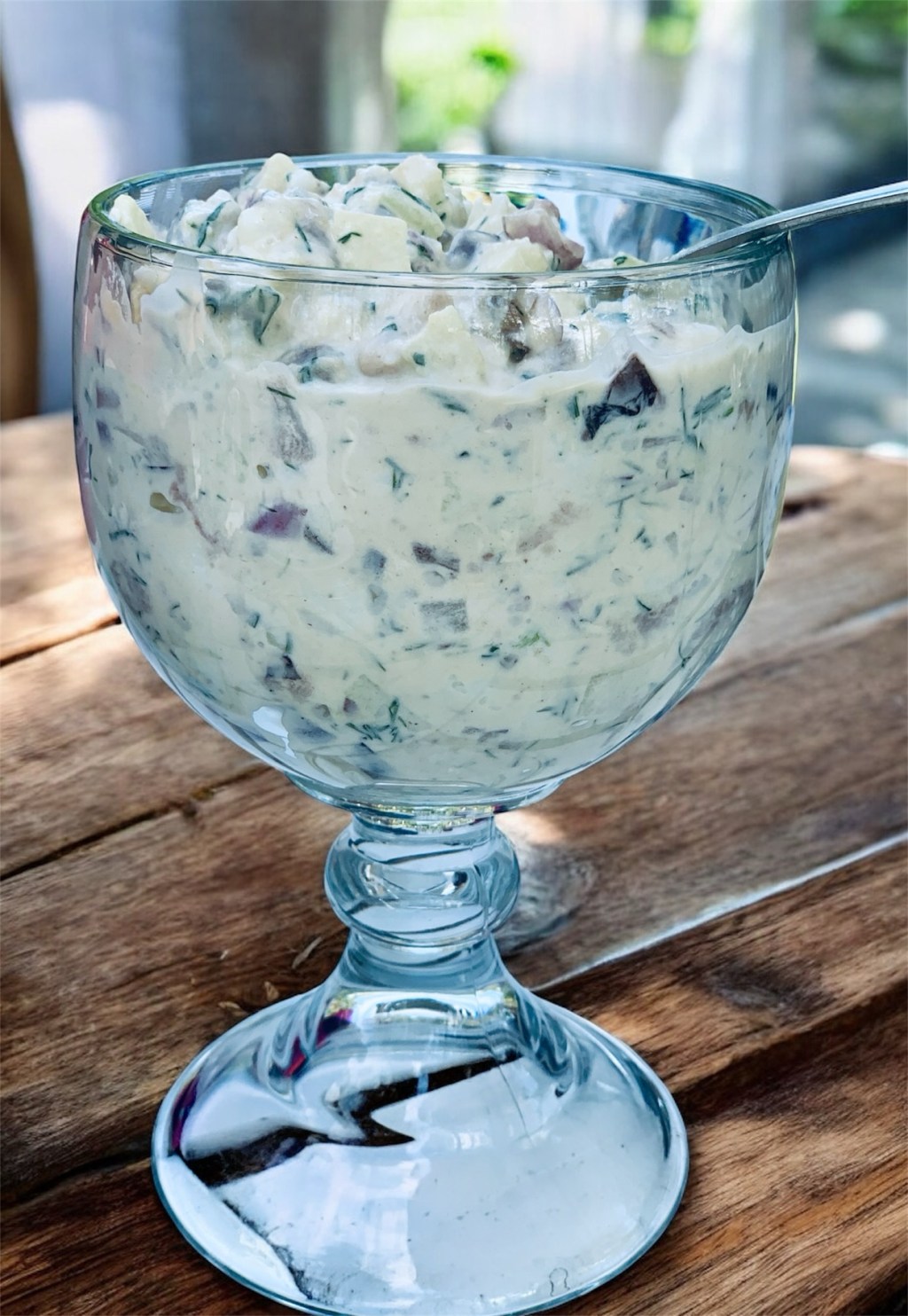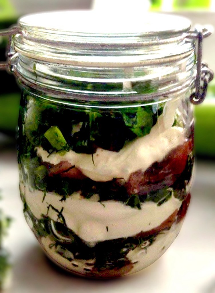 Lado lasipurkkiin kerroksittain sillipaloja, smetanaa ja ruohosipulitillisilppua.