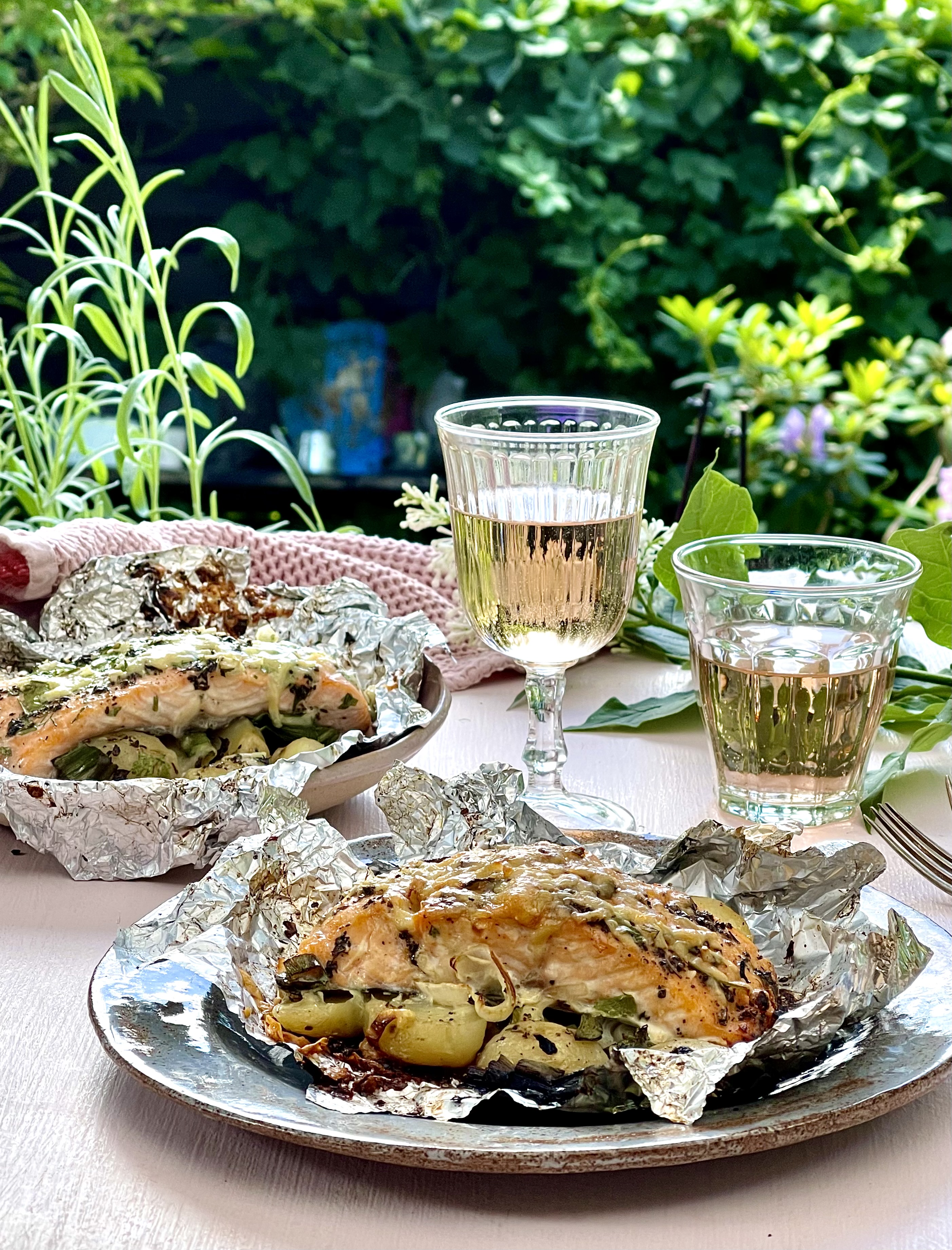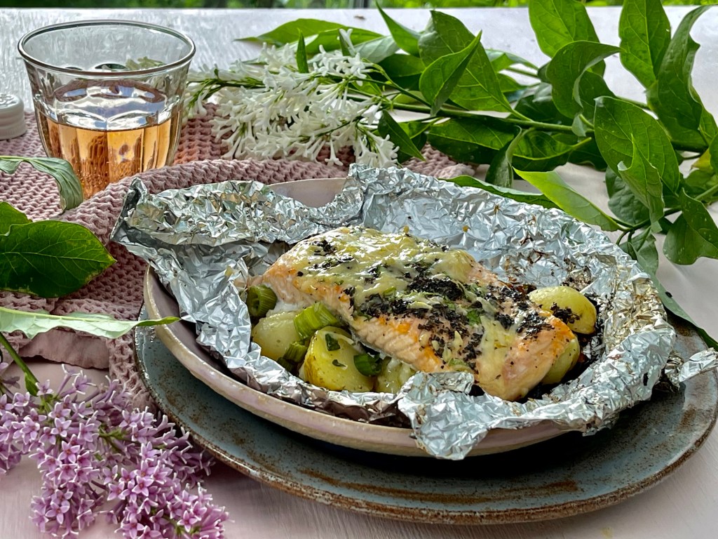 Juustoiset lohi-perunanyytit ovat kesäistä grilliruokaa. Jokainen ruokailija saa grillistä oman ”lahjapakettinsa”, joka nautitaan raikkaan salaatin kansa.