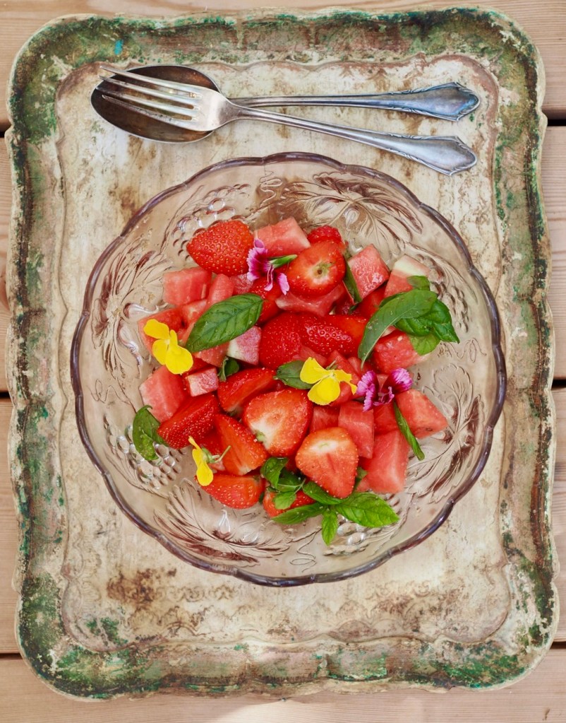 Viipaloi mansikat ja kuutioi vesimeloni. Voit tehdä melonista halutessasi palloja palloraudalla.