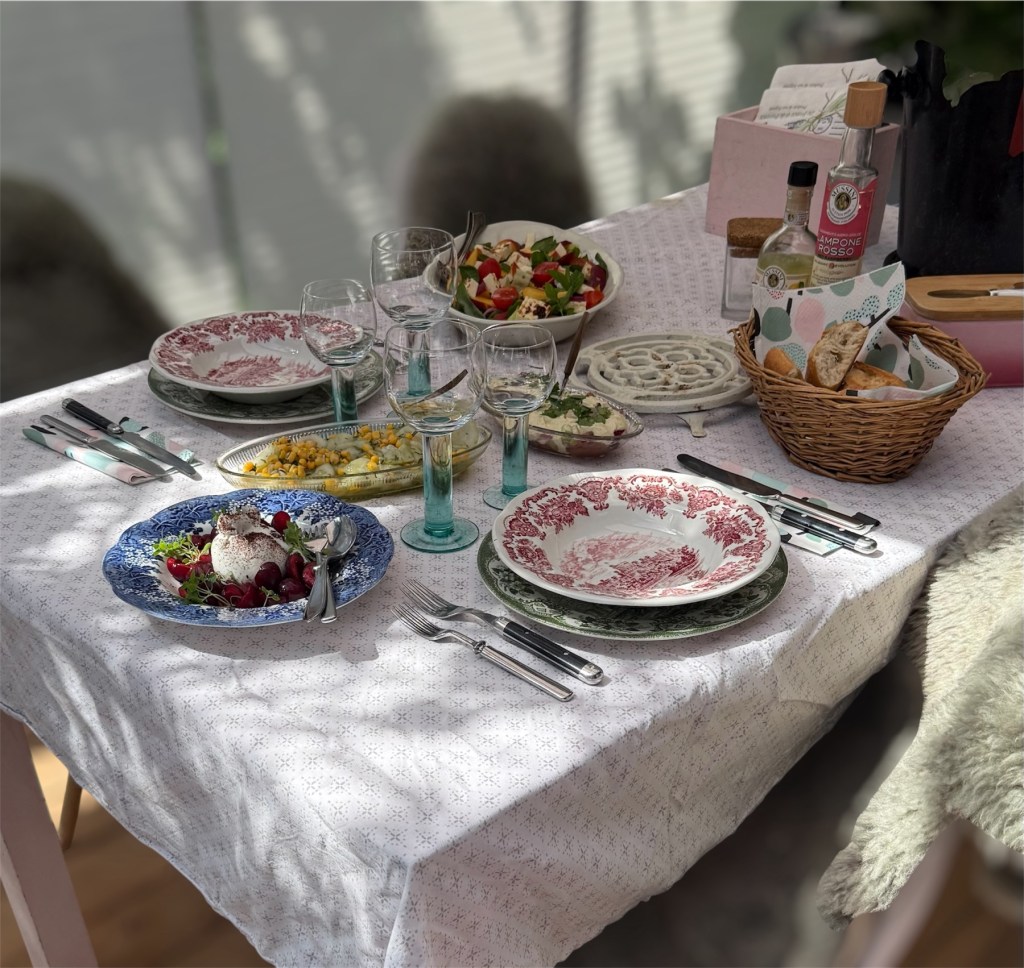 Helle hemmotteli, kun ystäväni tuli kesälounaalle. Niinpä kirpputoreilta löydetyillä astioilla katetussa pöydässä oli vain salaatteja. Yrttini kukoistavat, joten niitä käytän nyt lähes joka ruokaan.