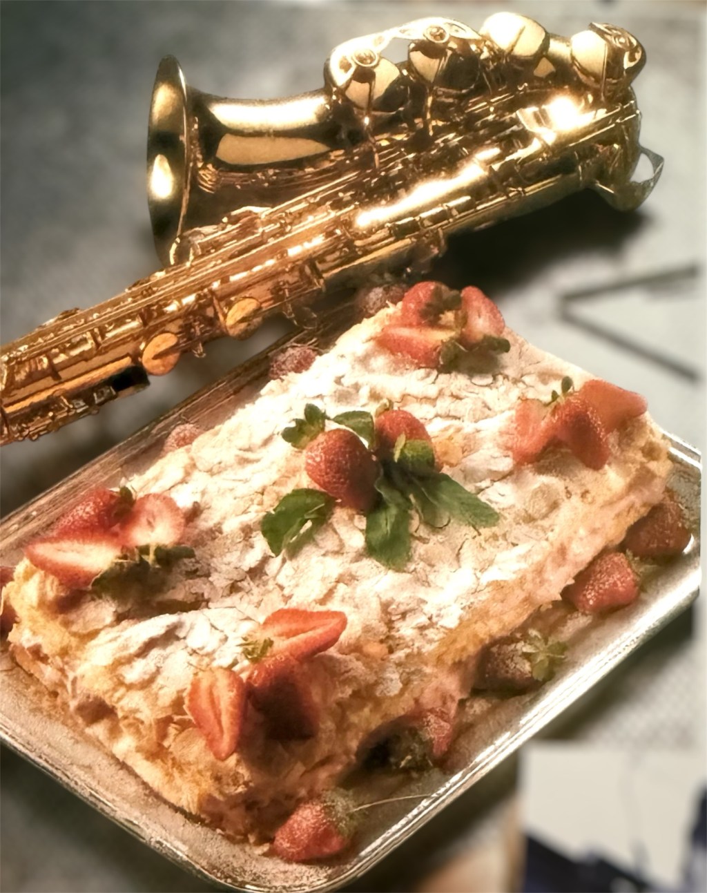 Puuteroi kakku tomusokerilla ja koristele tuoreilla mansikoilla tai hedelmillä.