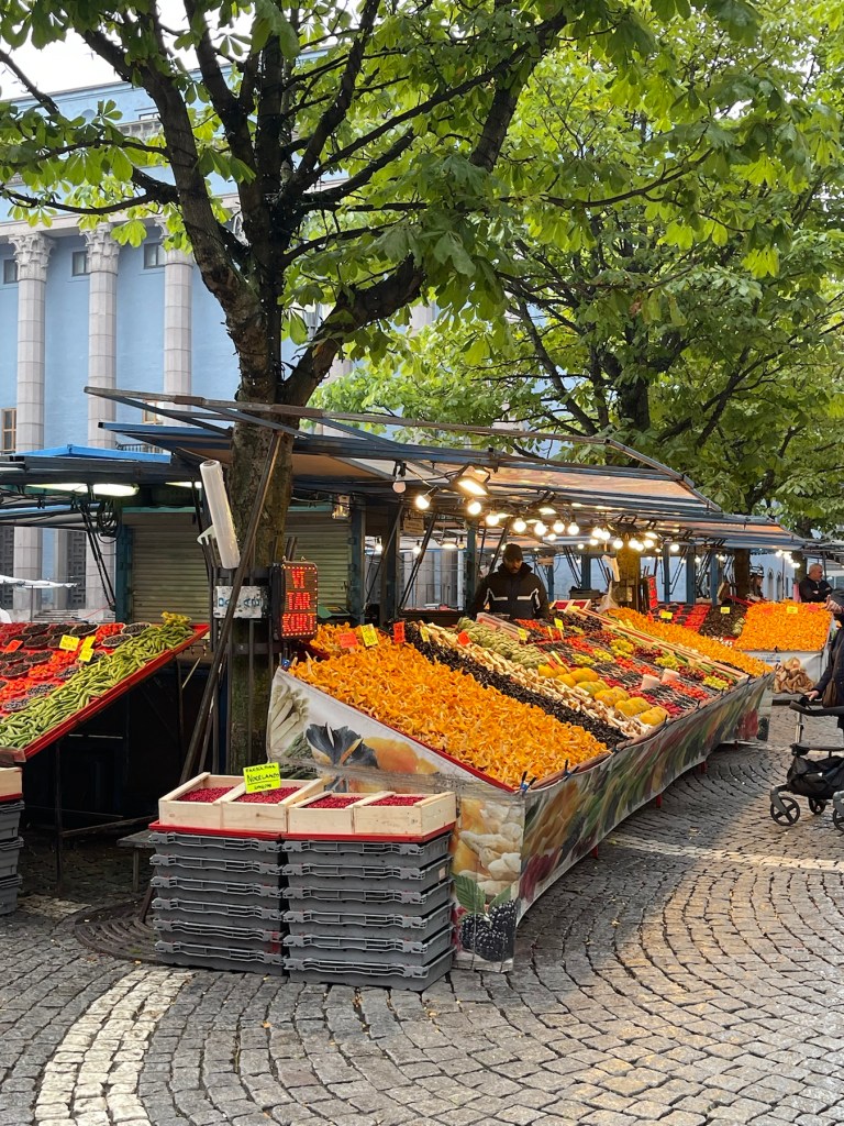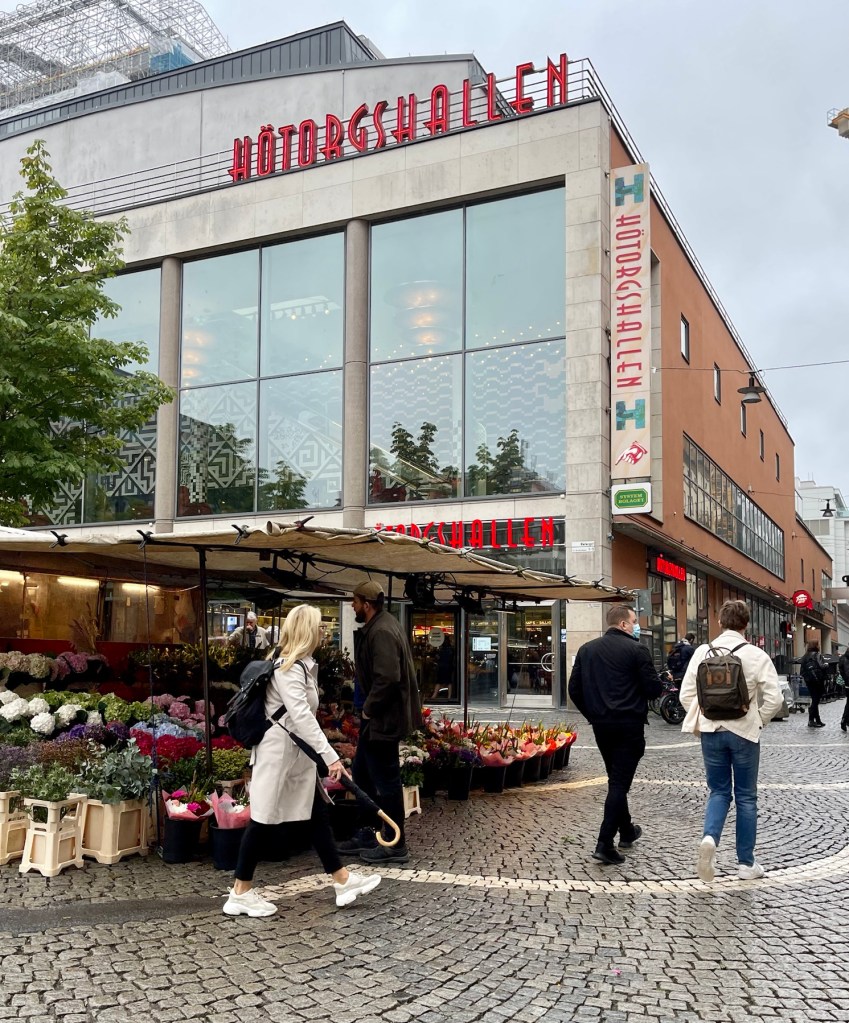 Tukholman bussiterminaalista kävelimme kohti keskustaa: Ensimmäinen pysähdys oli Hötorgshallen Segelgatanilla. Ensimmäinen kauppahalli avattiin Hötorgetille jo vuonna 1883 ja nykyinen, moderni halli avattiin osana uutta keskustaa vuonna 1958. Halli on keskustan kansainvälisin, ja sieltä löytää makuja eri puolilta maailmaa.