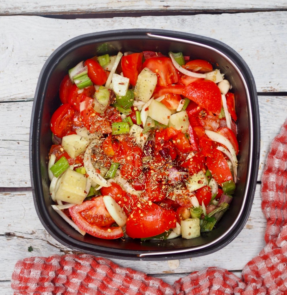 Minä valmistin ”gazpachon” kypsentämällä ainekset airfryerissa ja käytin ruokaan jo elämänsä kalkkiviivoilla olleita tomaatteja.