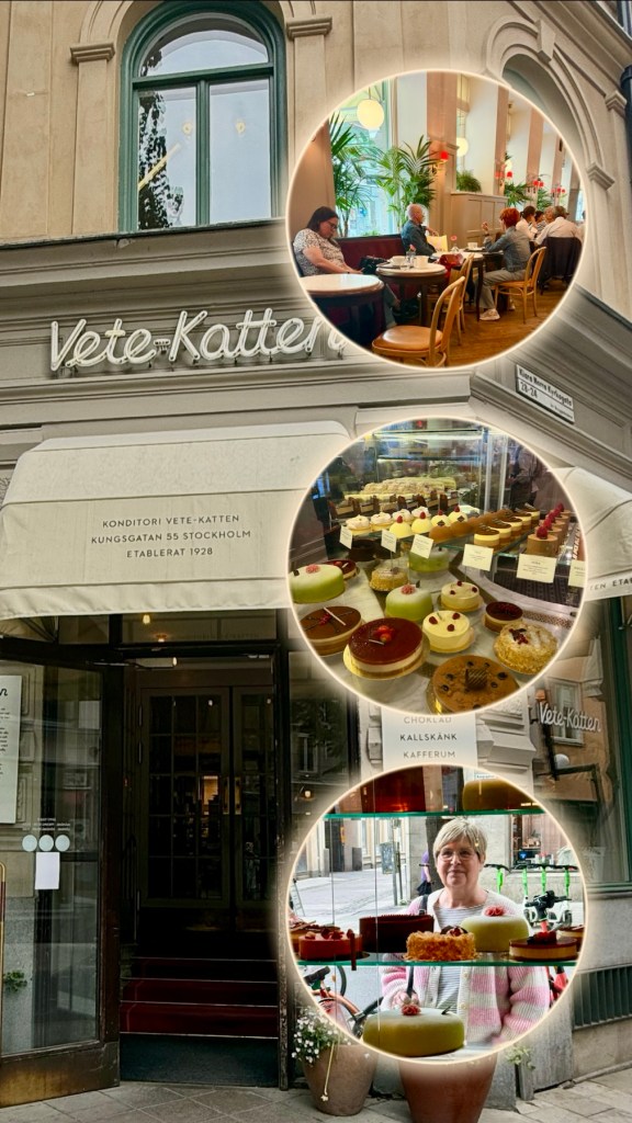 Parin sadan metrin päästä bussiterminaalista on Vete-Katten, ”Tukholman Ekberg”. Olemme vuosien ajan kävelleet Vete-Kattenin ohi, mutta tällä kertaa poikkesimme sinne päiväkahville ennen kuin bussi lähti takaisin laivalle. Vete-Katten perustettiin vuonna 1928 ja on siitä lähtien ollut tukholmalaisinstituutio. Klassiset kahvilat ovat nähneet työläisiä ja johtajia, juoksupoikia ja poliitikkoja, punkkareita ja seurapiirinaisia istuvan yhdessä lähes vuosisadan ajan. Heitä yhdistää rakkaus hyvään kahviin, ensiluokkaisiin leivonnaisiin ja rauhalliseen konditoriatyyliin. Vete-Kattenissa leivotaan kaikki alusta alkaen parhaista raaka-aineista, mitä on saatavilla.