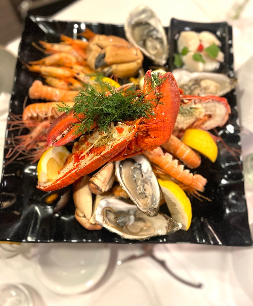 Olemme varanneet lähtöillaksi aina pöydän à la carteen. Siihen on syynsä. Suosikkimme vuosien varrella on ollut äyriäistarjotin, jota maissa on harvoin saatavilla. Äyriäistarjotin, joka askarrellaan hitaasti laivan samppanjan kanssa, tuntuu todelliselta juhlaillalliselta. Äyriäisvati pitää sisällään seuraavat herkut: 1/2 hummeri, tuoreita ja savustettuja katkarapuja, ostereita, sinisimpukoita, merirapuja, taskuravun saksia ja kampasimpukkaceviche. Lisukkeet ovat Rhode Island -kastike, aioli, salottisipulivinegrette, wakame-levä ja paahtoleipä. Talvella vati tulee varata kolme vuorokautta ennakkoon, kesäsesonkina se on aina tarjolla 54/58 euron hintaan.