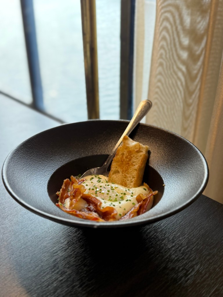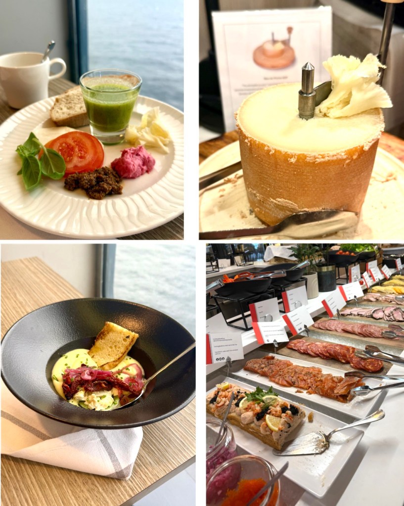 LUX Seaside Premium -hyttiimme kuuluu premium-aamiainen, muuten sen hinta on 25 euroa. Ystäväni tietävät, että en ole aamiais- ja brunssi-ihmisiä. Olimme iloisesti yllättyneitä aamiaispöydän uudistuksista. Tarjontaa oli selkeästi upgreidattu: laadukkaampia leikkeleitä ja juustoja (Tête de Moine, kuvassa) muna 64 perunavaahdolla ja pekonilla oli listalta pöytään tilattava herkku, ja monilta lautasilta näytti löytyvän niin voileipä- kuin kermakakkua. Skumppalasitkin olivat muuttuneet huiluista tulppaaneiksi! ”Tässähän odottaa jo huomista aamua”, totesin Annelle.