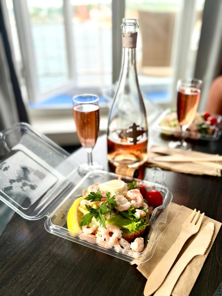 Laivalle palattuamme noudatamme jälleen Lady Linen traditiota. Kaupungilla lähes 15 000 askelta köveltyämme vaihdamme yöpuvut päälle ja nautimme hytissä katkarapuleivän kuplivan kera. Kun ostin leivät kahvilasta, kassa kysyi: ”Onko klubikorttia? Sillä saa leivästä euron alennuksen.” Leipä maksoi 9,50 euroa. Olipa kiva yllätys!