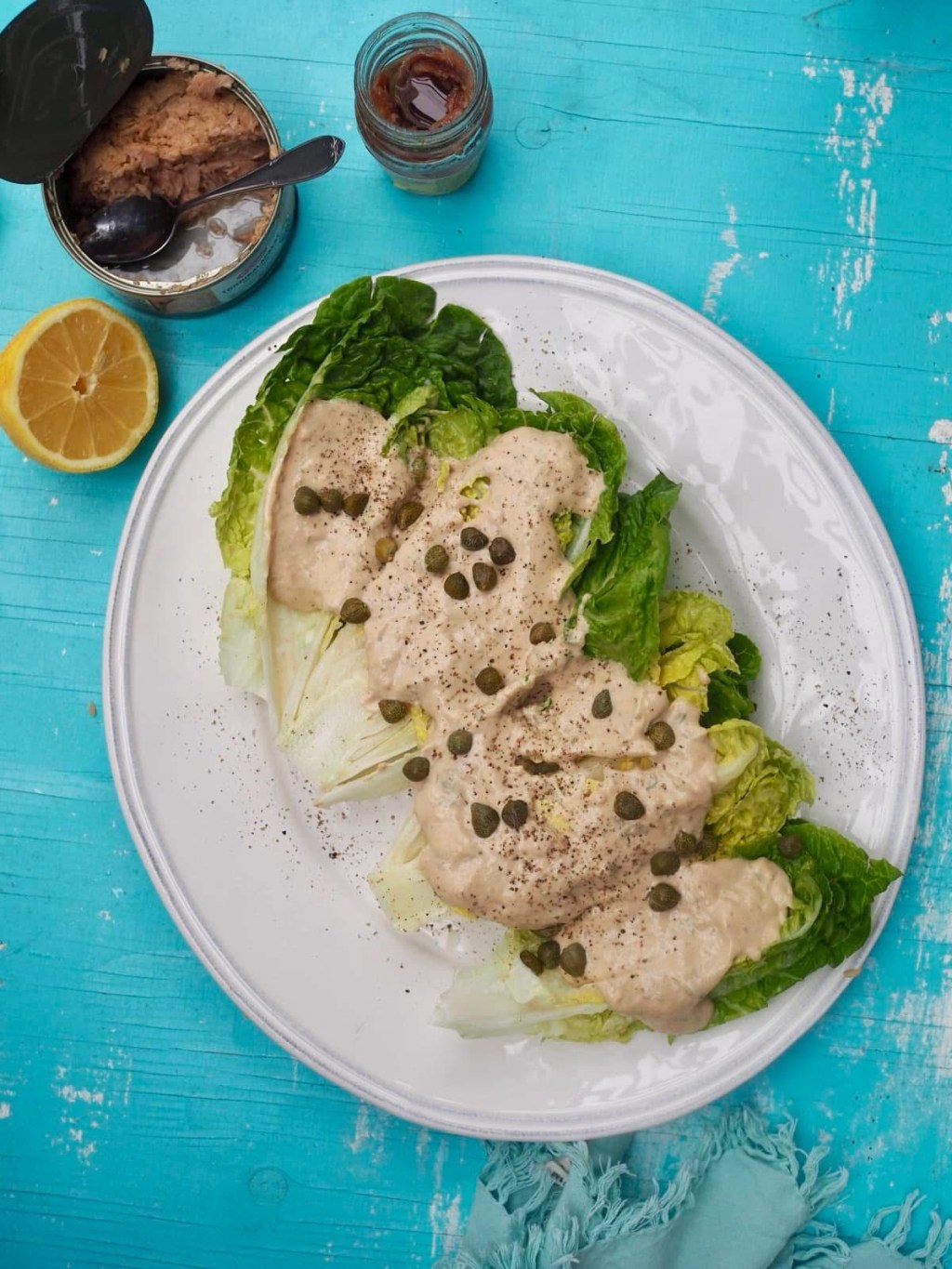 Vitello tonnato on yksi herkkuruokiani. Sehän on nimensä mukaisesti keitettyä vasikkaa tonnikalakastikkeessa. Vasikkaa ei Suomesta juuri saa, joten olen monesti korvannut sen tässä ruoassa savustetulla kalkkunalla. Mutta kun näin Mari Moilasen keväällä 2024 ilmestyneessä Tölkkiruokaa kirjassa klassikkokastikkeen yhdistettynä sydänsalaatiin, ihastuin ideaan heti! Mikä olisikaan herkullisempi salaatti. Se on myös mainio alkuruoka vaikka grillijuhlissa.