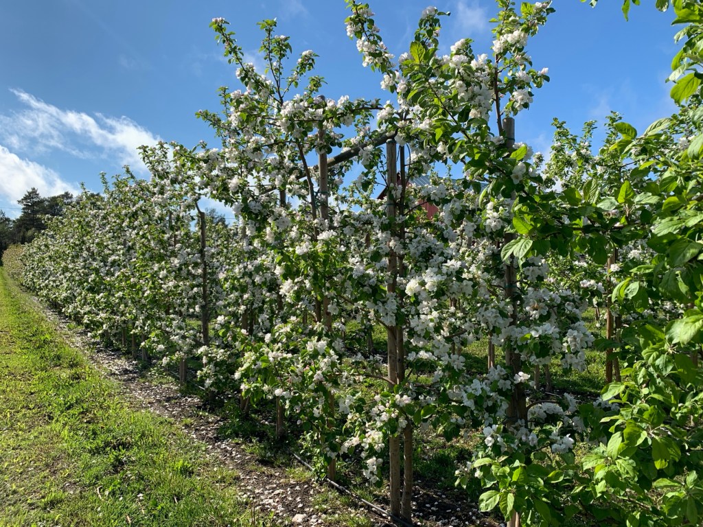 Alkukesästä Ahvenanmaan omenapuut kukkivat valkoisina. Yli 70 prosenttia suomalaisista omenoista viljellään Ahvenmaalla.