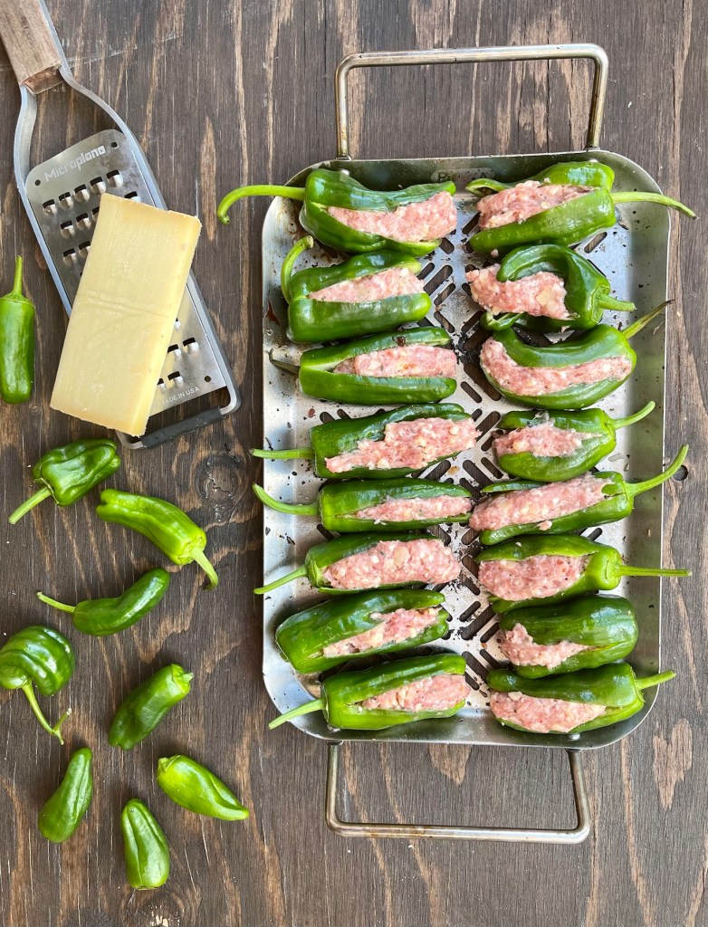 Halkaise Padron-grillipaprikat ja laita jokaisen paprikan väliin makkarapulla. Pane täytetyt paprikat grillausalustalle.
