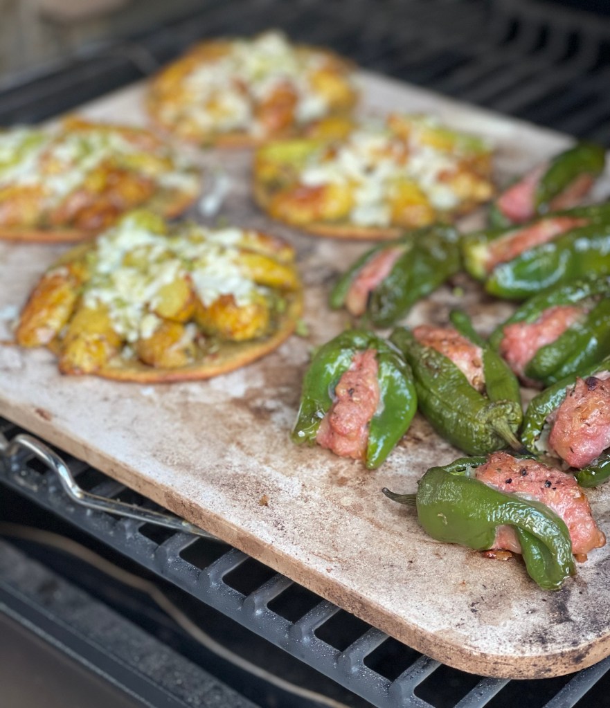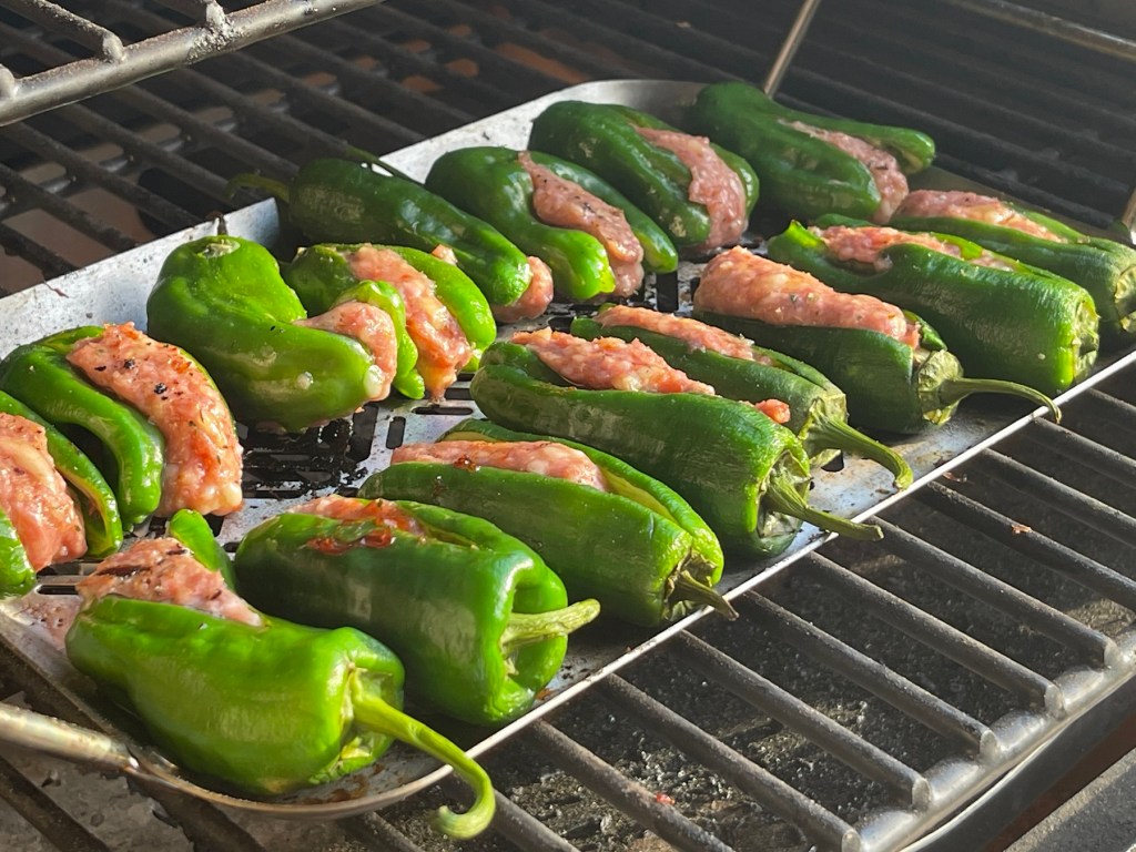 Pienet vihreät pimientos de padron -paprikat ovat monelle Espanjan kävijälle tuttu grillattava. Kuumilla hiilillä ne valmistuvat vaivatta ja sopivat napsteltavaksi sellaisenaan. Minä sain päähäni täyttää ne raakamakkaralla.