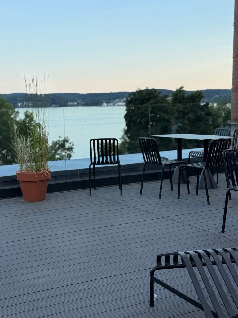 Saunassa on oikein viihtyisä terassi, josta näkymät Pyhäjärvelle.