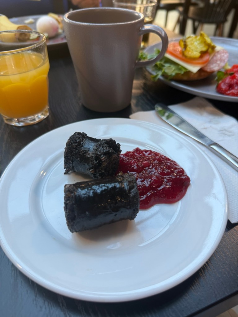 Hotellihuoneeme hintaan ei kuulunut aamiaista, mutta sen saattoi ostaa 16,90 euron hintaan. Aamiaisbuffassa oli erittäin hyvä hinta-laatusuhde. Tarjolla oli mm. tuoreita mansikoita ja suomalaista pannukakkua. Ja tietenkin mustaamakkaraa puolukkahillolla!