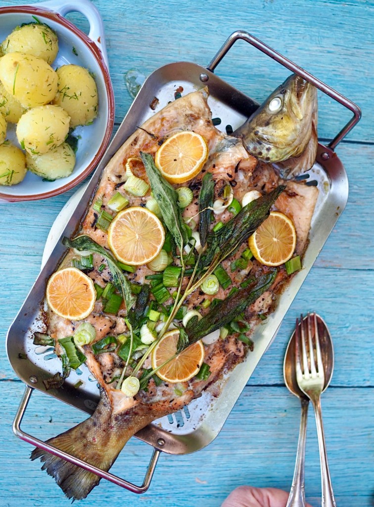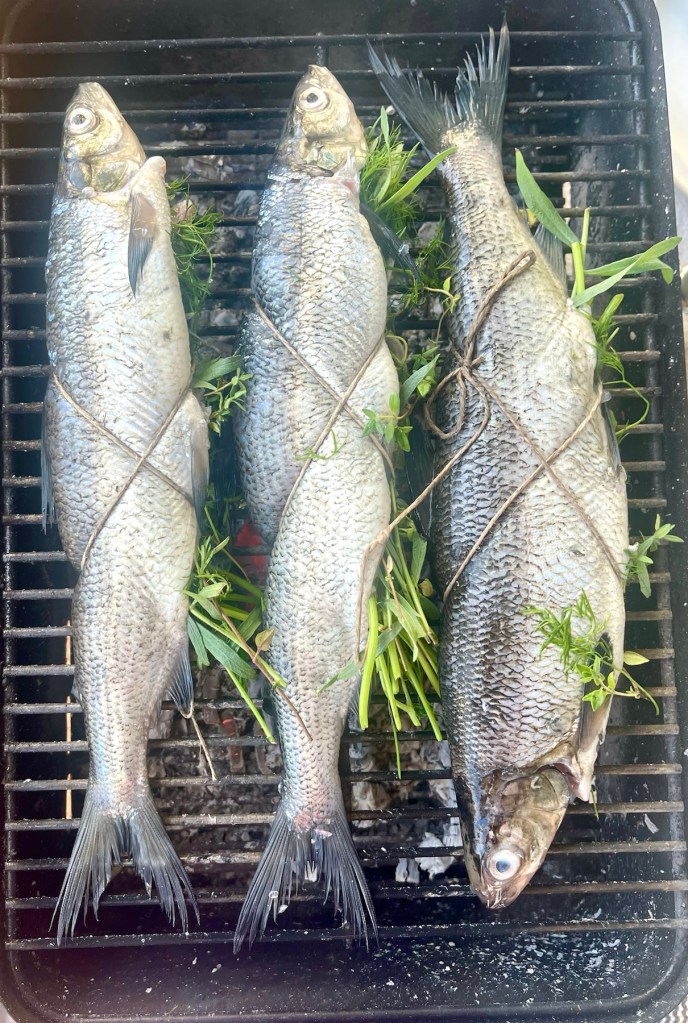 Grillattua kalaa ja oliivi-kurkkulisäke