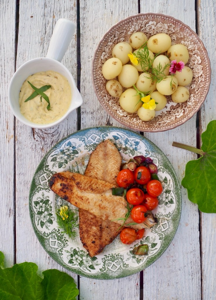 Kokonaisena grillattua kalaa ja oliivi-kurkkulisäke