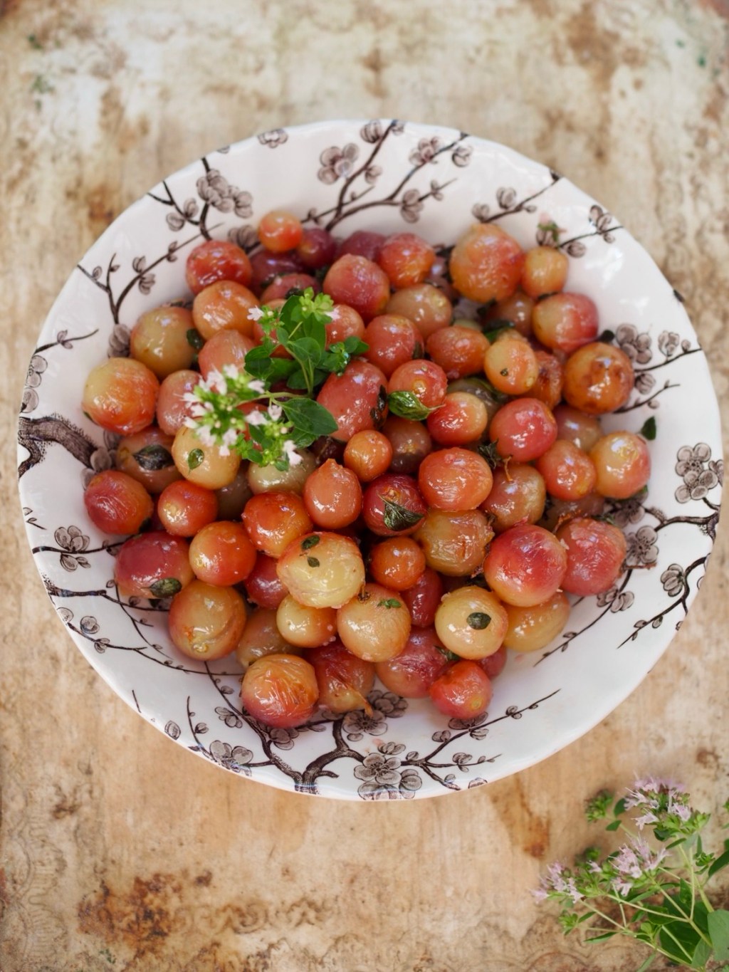 Pyöräytä viinirypäleet kevyesti tilkassa oliiviöljyä. Riivi joukkoon tuoretta timjamia ja ripottele päälle suolaa ja viinietikkaa. Pane rypäleet paistovuokaan tai käytä airfryeriin sopivaa leivinpaperia.