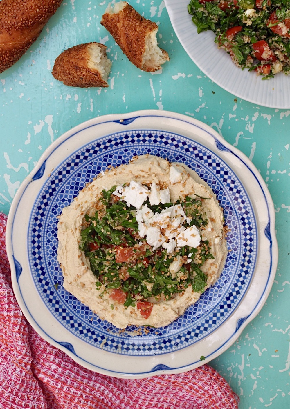 Nosta kuoppaan taboullehia ja salaatin päälle fetaa murennettuna. Koristele seesaminsiemenillä.