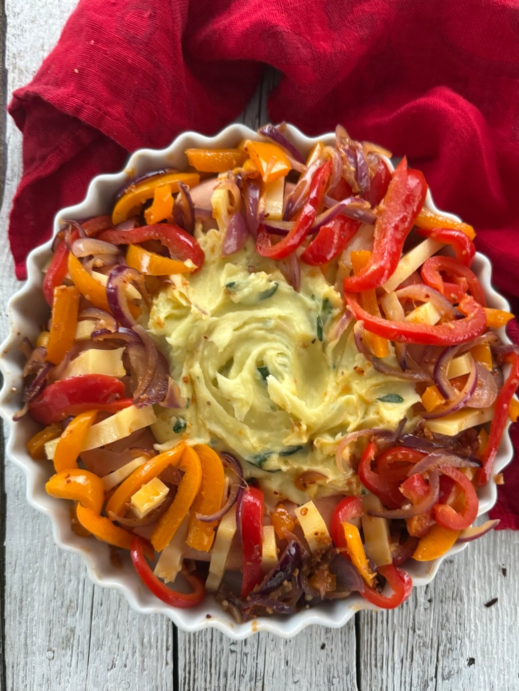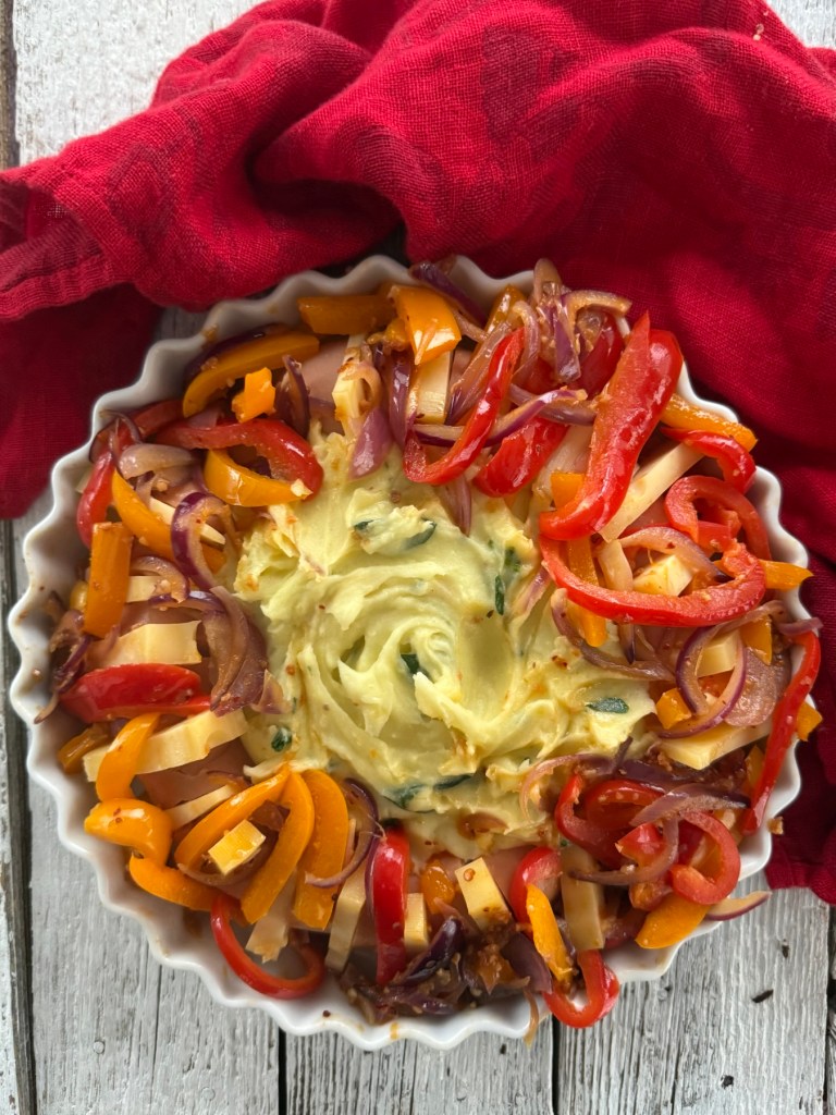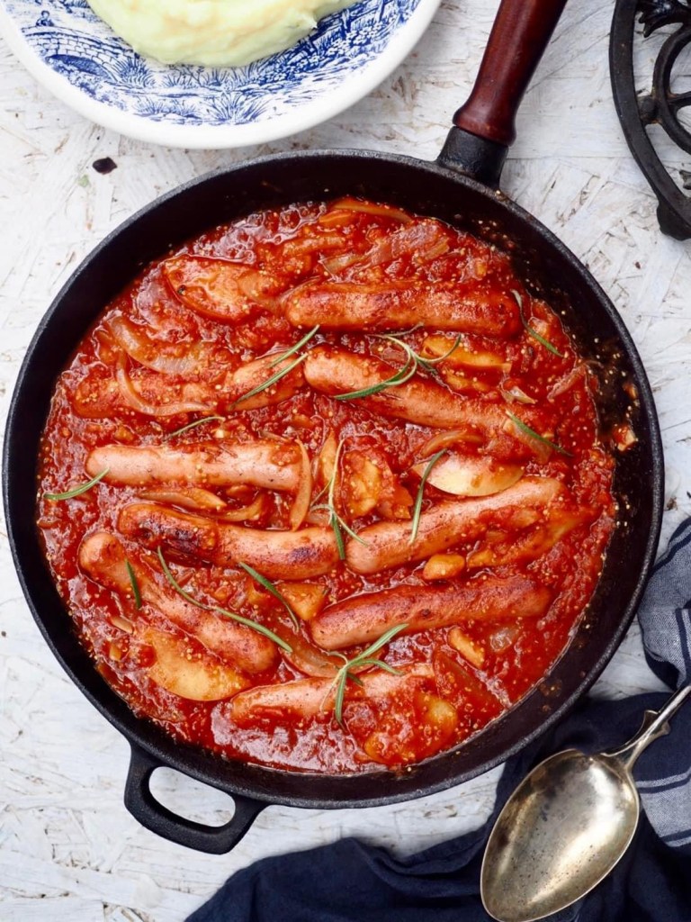 Poista lenkistä kuori. Villota lenkki ja aseta juustot villtokohtiin. Nosta lenkit pannuun. Lisää perunamuusi.