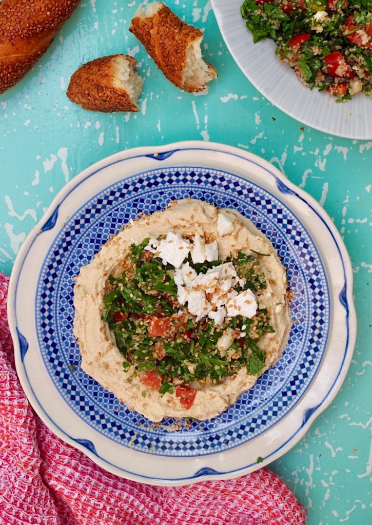 Tabboulehilla ja fetalla ladattu hummus