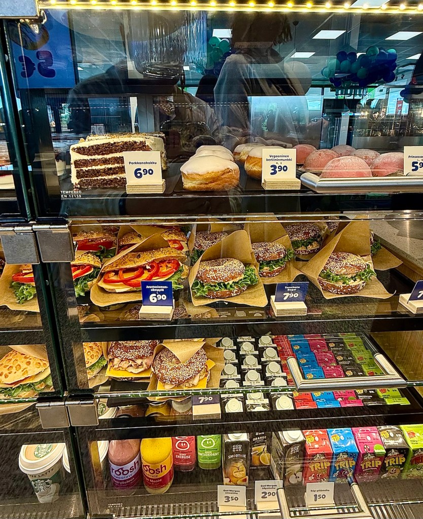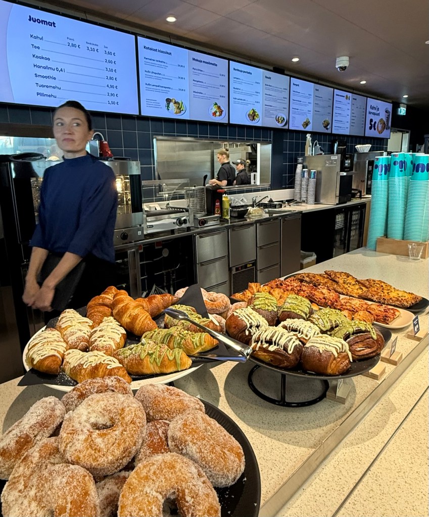 Vitriinissä on omatekoisia bageleita, wrappeja ja paikallisia erikoisuuksia sekä makeita vaihtoehtoja, kuten pistaasipuusteja ja croissantteja.