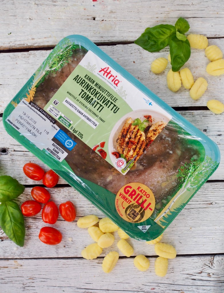 Testasin Atrian Kanan minuuttifileitä aurinkotomaattimarinadissa valmistamalla siitä yhden astian ruuan. Marinadi vei ajatukseni Marry me -kanaan. Olen menossa nyyttikesteille, joten yhden astian ruoka on helppo ottaa mukaan. Muut ainekset löytyivät kotivarastani.