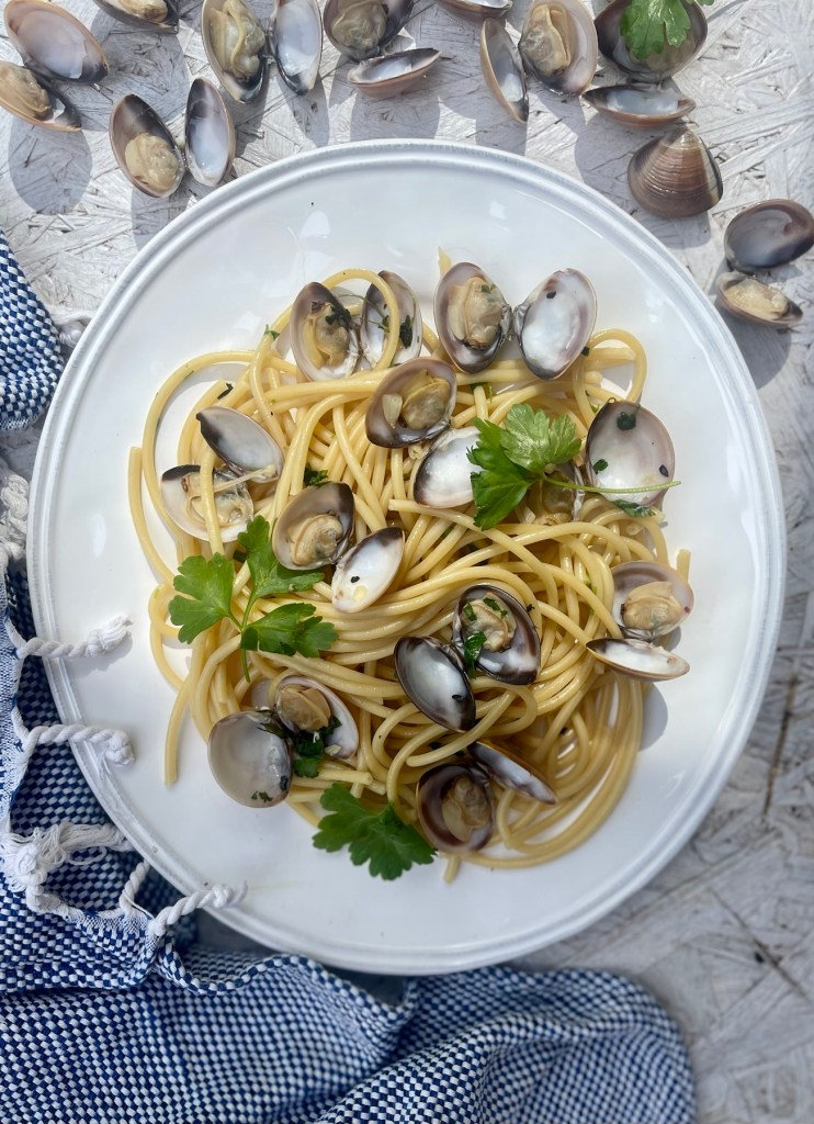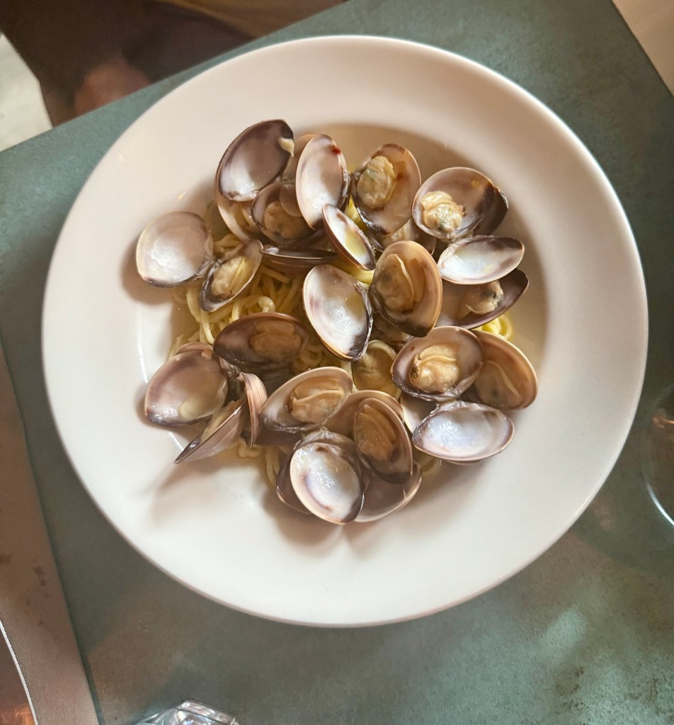 Käsintehtyä tagliolinipastaa, sydänsimpukoita, valkosipulia, chiliä, persiljaa ja sitruunaa, 24 e.