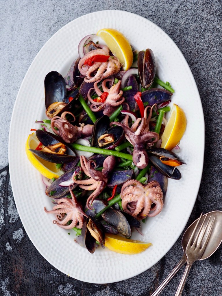 Mustekalasalaatti on raikas ja herkullinen. Rakastan mustekalaa, mutta kokin pitää tietää miten se valmistetaan, jotta lopputulos ei ole sitkeä.