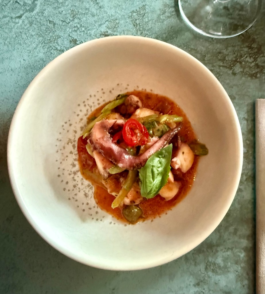 Ruokalistaa lukiessani tiesin heti mitä haluan: antipastiksi mustekalasalaatin.