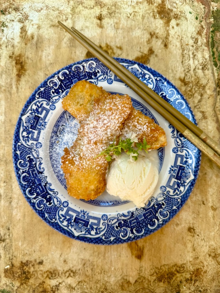 3. Munia käytetään banaanien kuorruttamiseen, jotta panko-leivänmurut tarttuvat niihin.