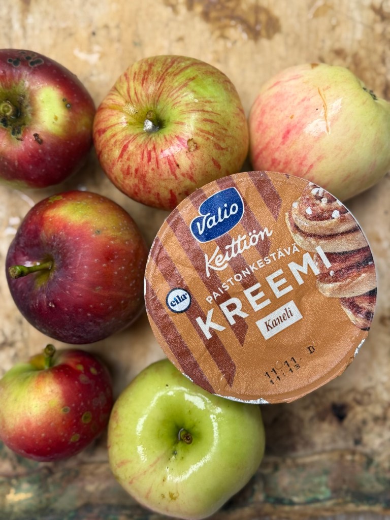 Olin bongannut kaupassa Valion uuden sesonkituotteen eli kanelikreemin. Halusin kokeilla sen parittamista omenapuitteni tuottamiin hedelmiin. Tänä vuonna oli surkea omenavuosi, sato oli pieni ja omput muumioituivat puuhun.