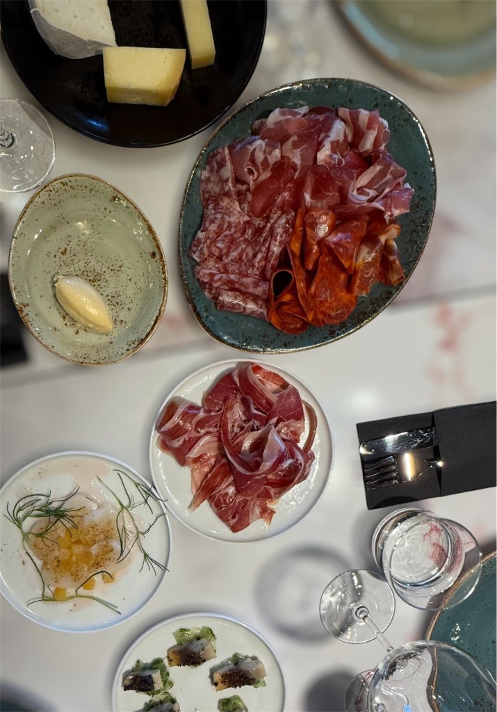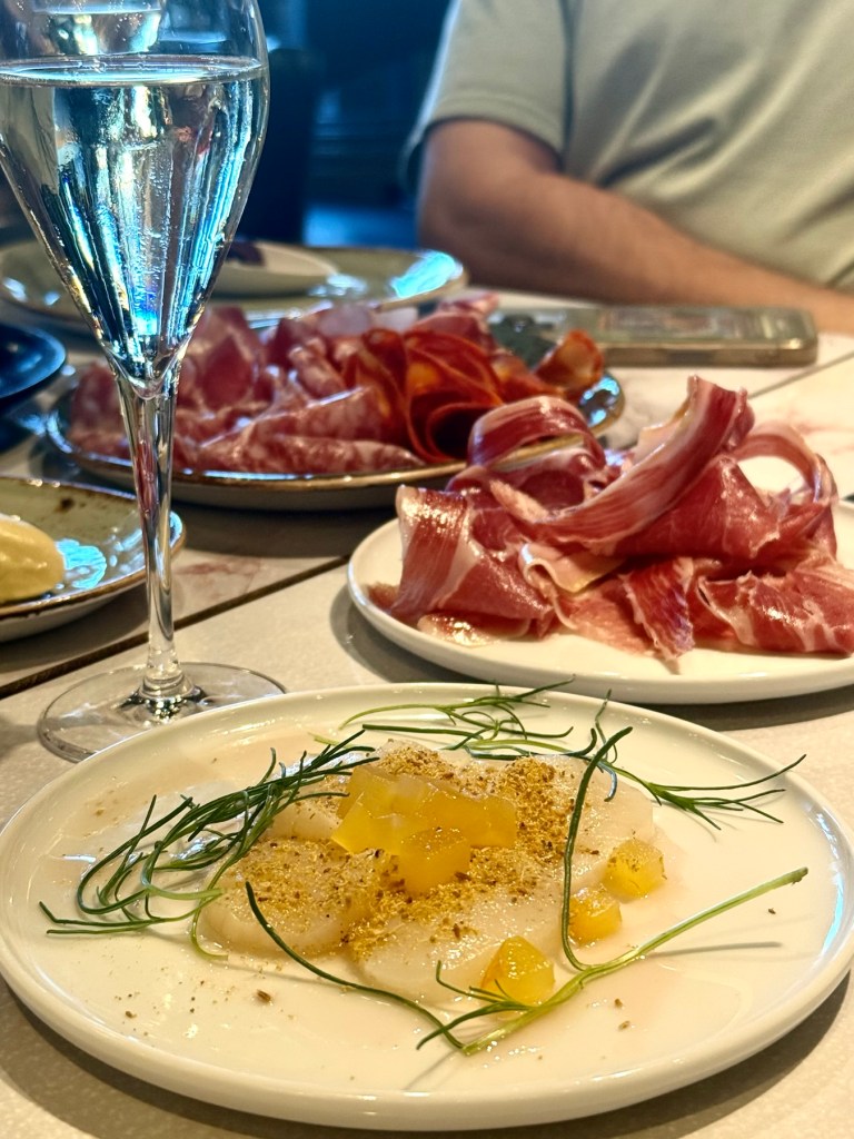 kampasimpukka fenkolin siitepölyllä ja luumulla ja ilmakuivattua Bellota-kinkku.