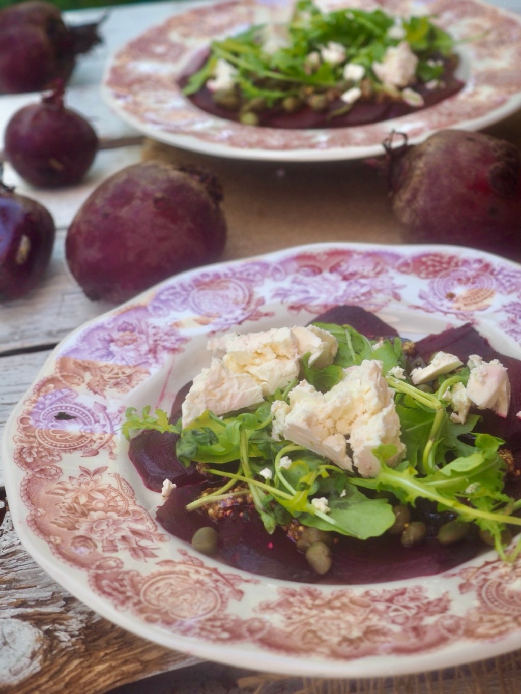 Nosta keskelle kourallinen rucolaa ja murentele päälle feta- tai vuohenjuusto.
