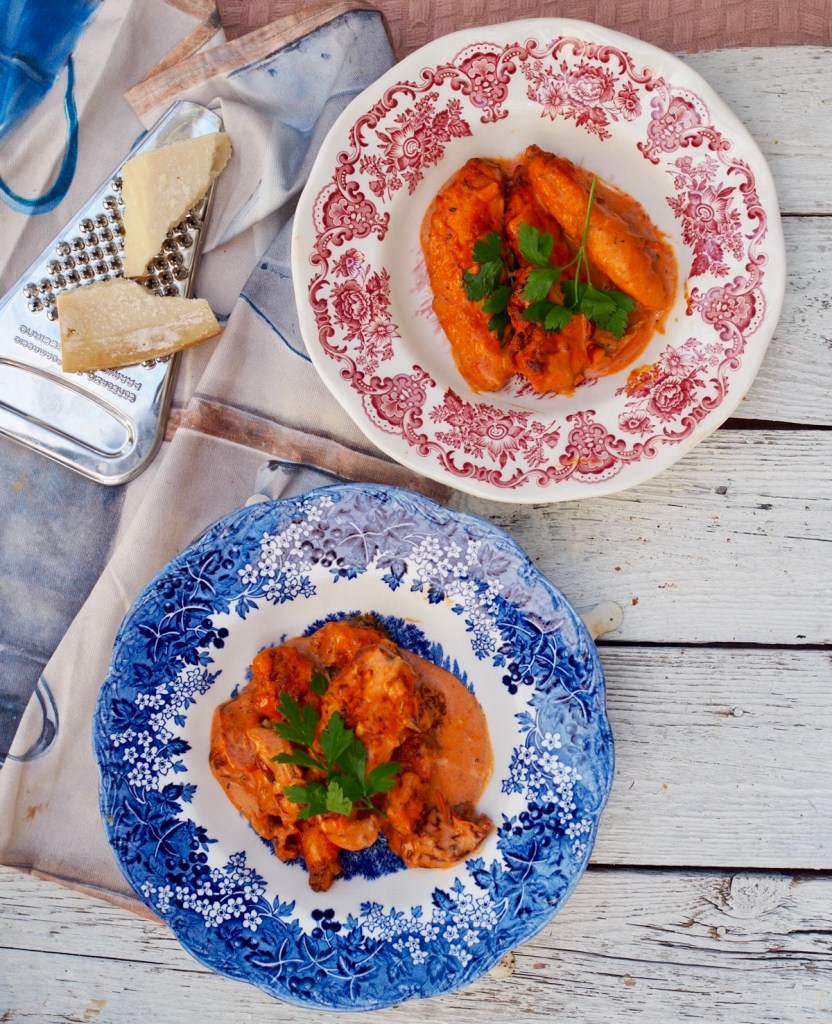 Ripottele päälle lehtipersiljaa tai tuoreita basilikanlehtiä ja loppu parmesaanista. Tarjoa pastan tai riisin kanssa. Minulle riitti lisäkkeeksi pelkkä salaatti. Hyvää oli!