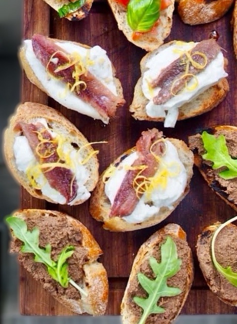 Vietimme naisporukalla ystävämme eläköitymisjuhlia italialaisessa hengessä. Minä vastasin alkupaloista ja tein kolmenlaisia bruschettoja (vai sittenkin crostineja?) kananmaksaa ja sipulimarmeladia, mozzarellaa, sardellia ja raastettua sitruunankuorta sekä kantarelli-purjoleipiä. Nautimme nämä spumanten kanssa.