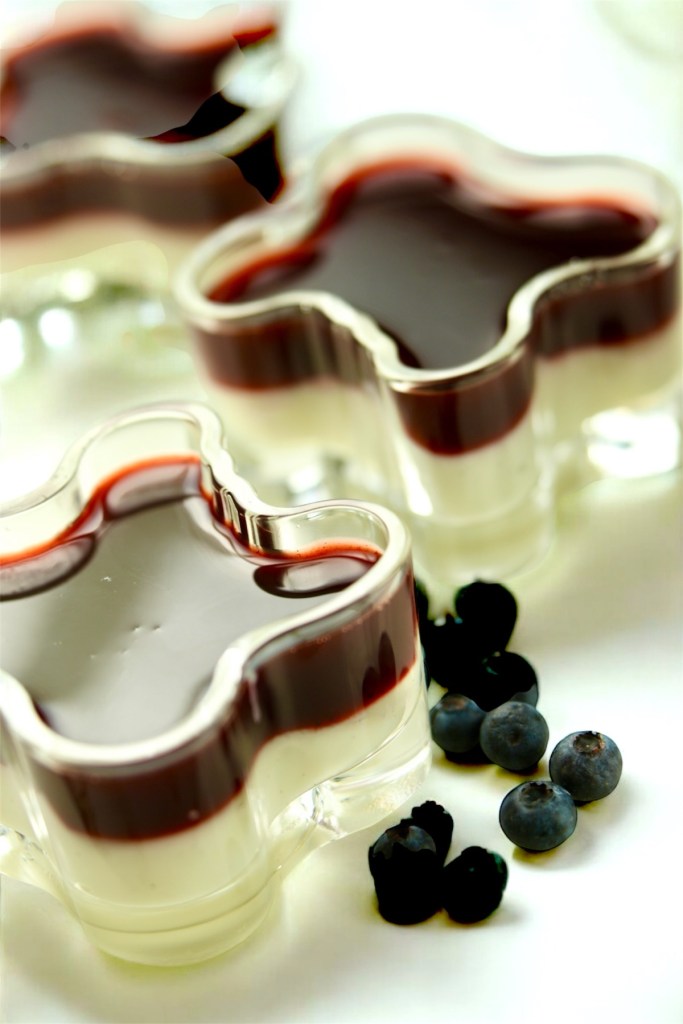 Kaada kiisseli tarjoiluastiaan. Ripottele sokeria pinnalle, niin kiisseli ei kuorretu. Lusikoi jäähtynyt marjakiisseli kuutamokiisselin päälle.