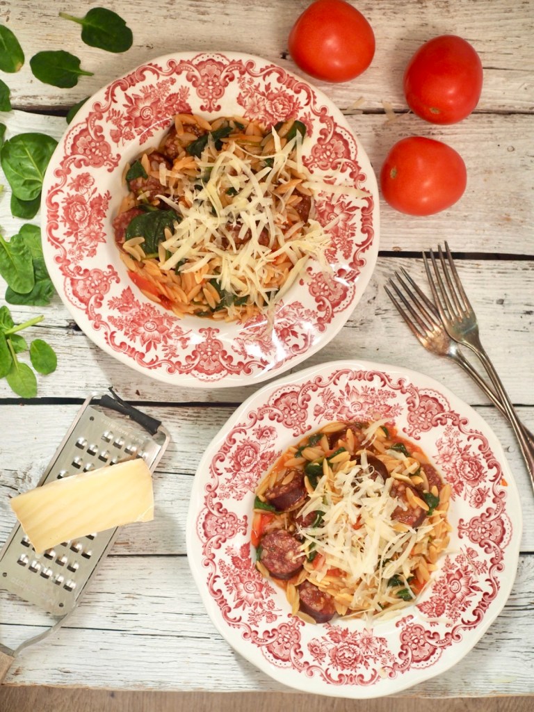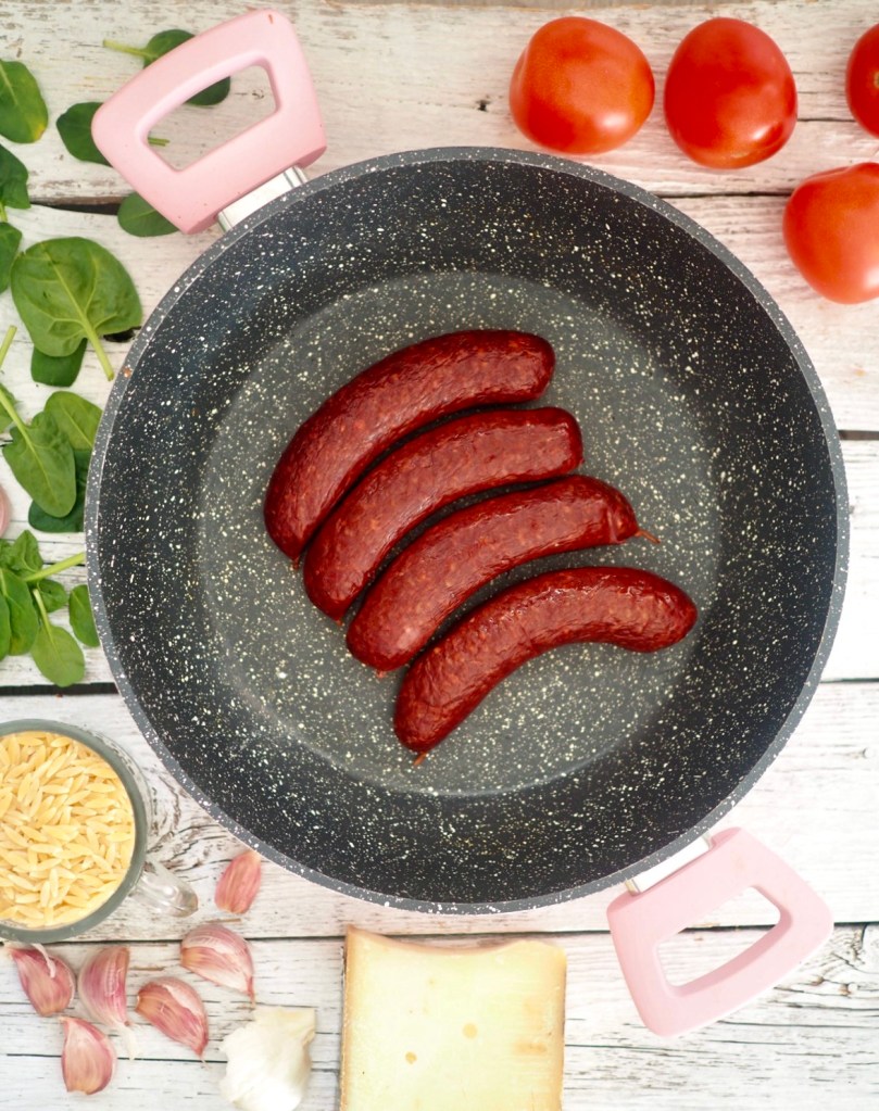 Tämä italialainen makkarapasta valmistuu helposti yhdellä pannulla. Orzo-pasta surffaa trendien huipulla, mutta tämä tarjoushaukka yhdisti siihen retrolta kuulostavan kotimaisen, palkitun ryynimakkaran. Toki ruoan voi valmistaa mistä mausteisesta makkarasta tahansa. Tämä on nopea ruoka arkeen tai päiviin jolloin ei haluta viettää paljoa aikaa keittiössä. Ruoka nimittäin valmistuu puolessa tunnissa.