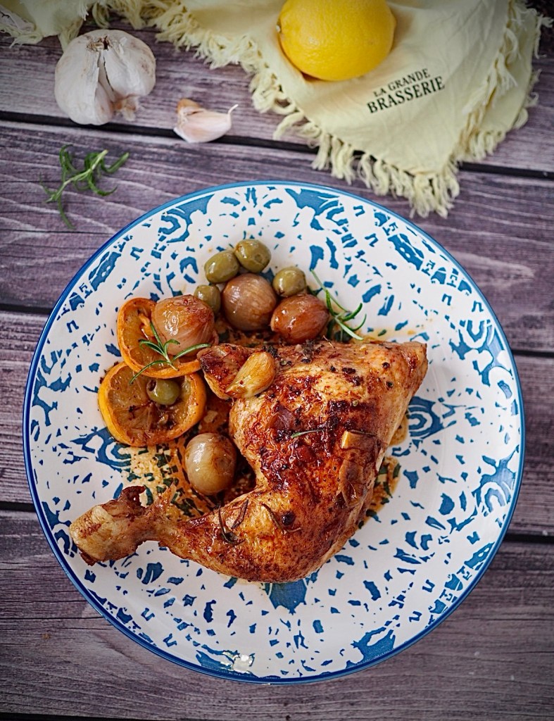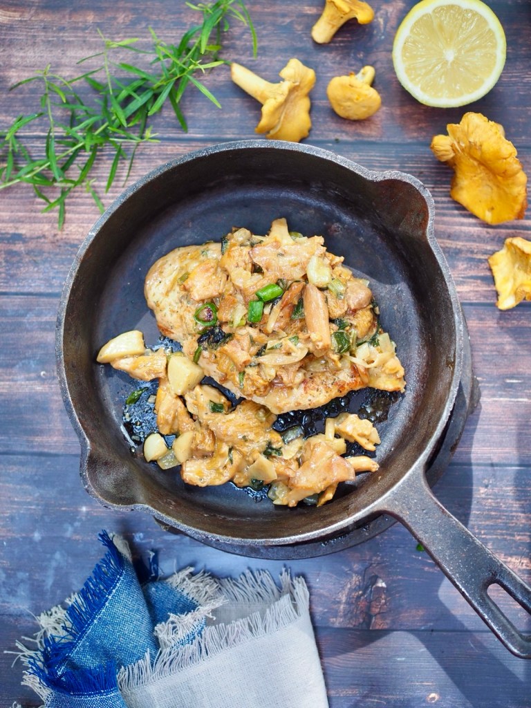 Lisää pannulle sipulit, sitruunaviipaleet, yrtit ja oliivit. Kypsennä pari minuuttia ja lisää kanaliemi (tai valkoviini).