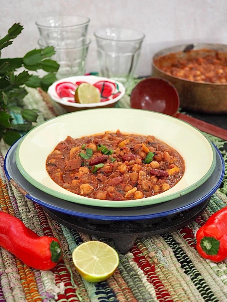 Kasvispäivän täyteläinen ja täyttävä safka on vegaaninen, suklaalla viimeistelty Chili sin Carne. Tällä kertaa se syntyi ns. hävikkiperiaatteella otetaan mitä on!
