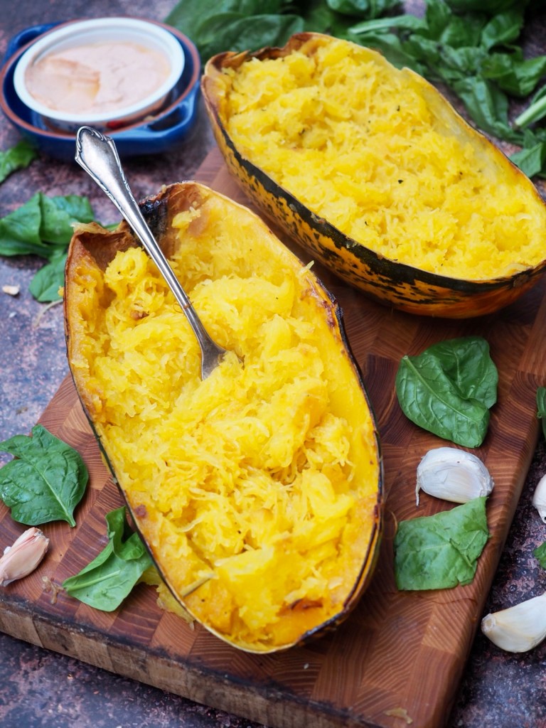 Kun kurpitsa on kypsä, nyhdä sisus haarukalla spagettimaiseksi.