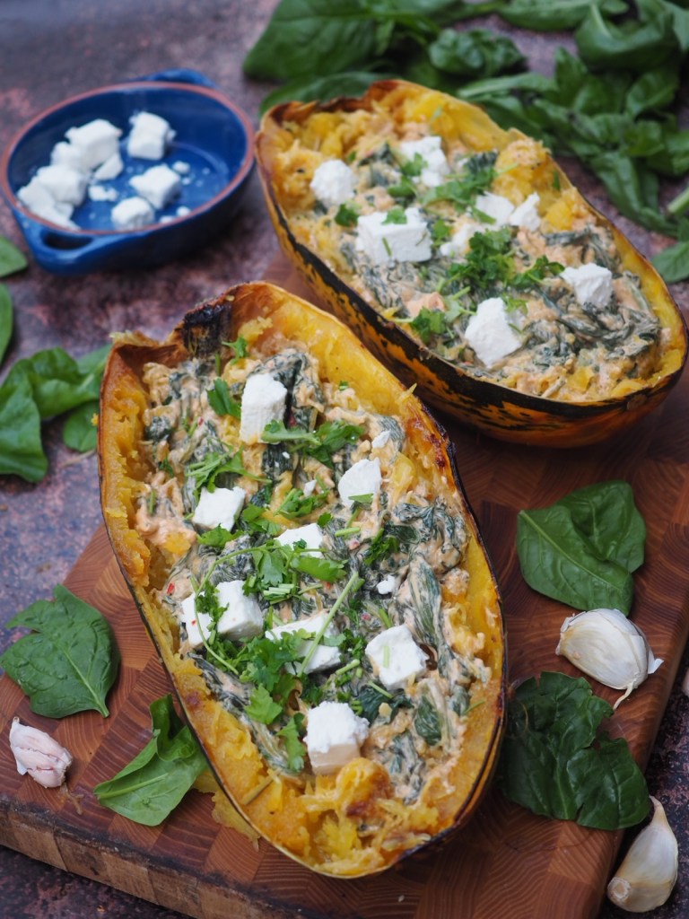 Lisää pinaattimuhennosta jokaiseen kurpitsa-veneeseen ja sekoita. Ripottele pälle fetaa (ja halutessasi lisää raastettua juustoa tai parmesaania.)
