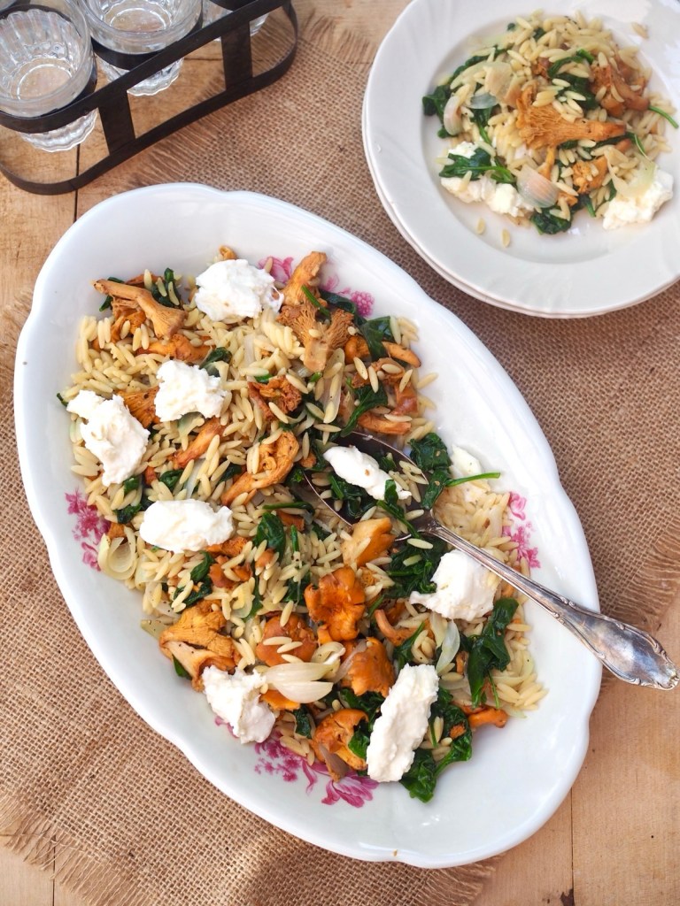 Lämmin kantarelli-pinaatti-pastasalaatti