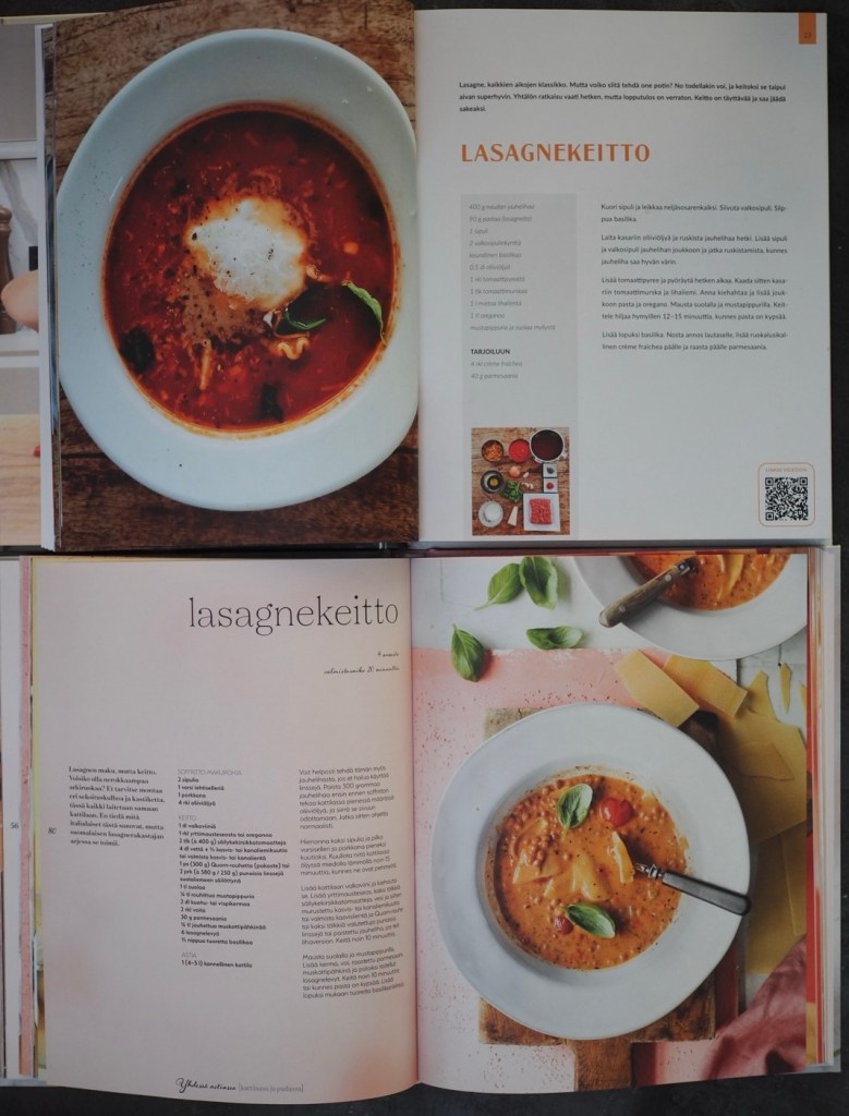 Sunnuntailounas oli miesystäväni eli herra Puhin heiniä, koska selkäni on pahasti jumissa ja liikkuminen vaikeaa. Hän oli bongannut Harri Syrjäsen keittokirjan ja kysyi olenko nähnyt sitä. Sanoin, että tuossahan se on työpöydälläni. Selasimme yhdessä kirjan läpi: pastaa, pastaa, pastaa… Lasagnekeitto houkutteli meistä kumpaakin. Selasimme läpi myös Sanna Mansikkamäen Yhdessä astiassa -keittokirjan, josta siitäkin löytyy lasagnekeitto. Herra sai valita kummalla ohjeella tehdään ja hän päätyi Harrin ohjeeseen todeten: ”Tässä on selvästi eri kohderyhmien keittokirjat: toinen on äijille ja toinen naisille”. Harrin ohje oli kaikkiaan suoraviivaisempi, vähemmän aineita ja kaikki niistä löytyivät kaapistani. Lisäksi se on jauhelihakeitto. Sannan keitto on vegeversio, jossa kyllä sanotaan, että linssit voi halutessaan vaihtaa jauhelihaan.