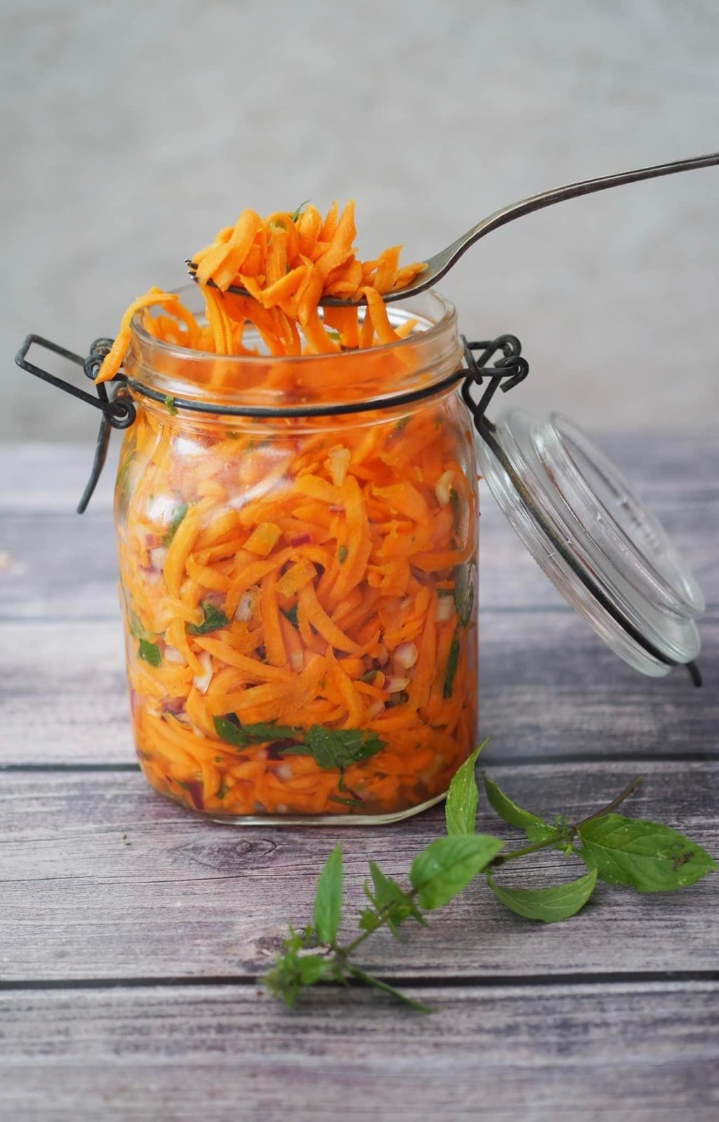 Niinpä tein intialaisen porkkanasalaatin, joka on maustettu inkiväärillä ja mintulla. Purkilliselle salaattia tulee hintaa noin 1 1/2 euroa.