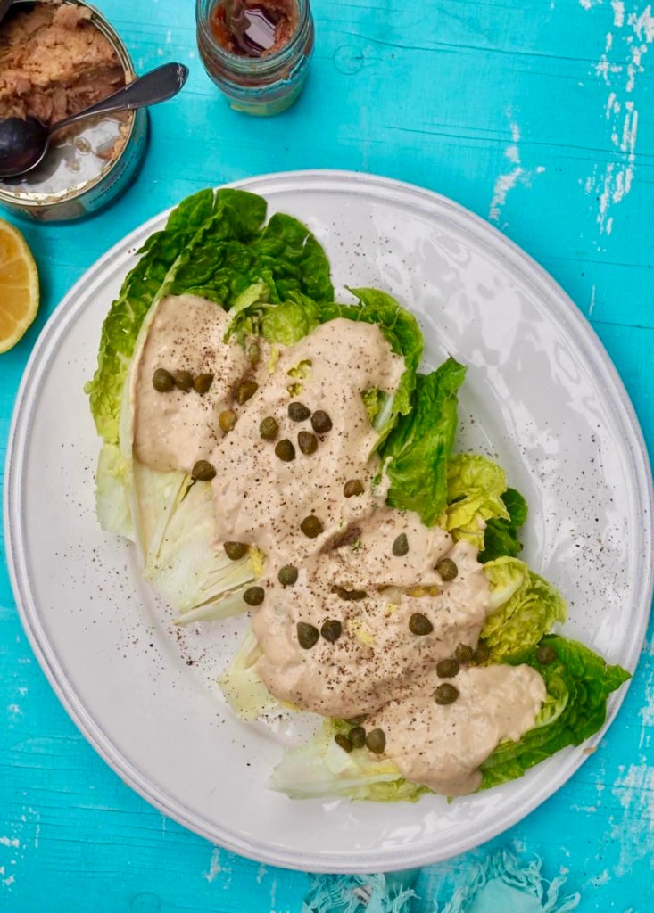 Vitello tonnato on yksi herkkuruokiani. Sehän on nimensä mukaisesti keitettyä vasikkaa tonnikalakastikkeessa. Vasikkaa ei Suomesta juuri saa, joten olen monesti korvannut sen tässä ruoassa savustetulla kalkkunalla. Mutta kun näin Mari Moilasen keväällä ilmestyneessä kirjassa klassikkokastikkeen yhdistettynä sydänsalaatiin, ihastuin ideaan heti! Mikä olisikaan herkullisempi kesäpäivän tai -illan salaatti. Se on myös mainio alkuruoka vaikka grillijuhlissa.