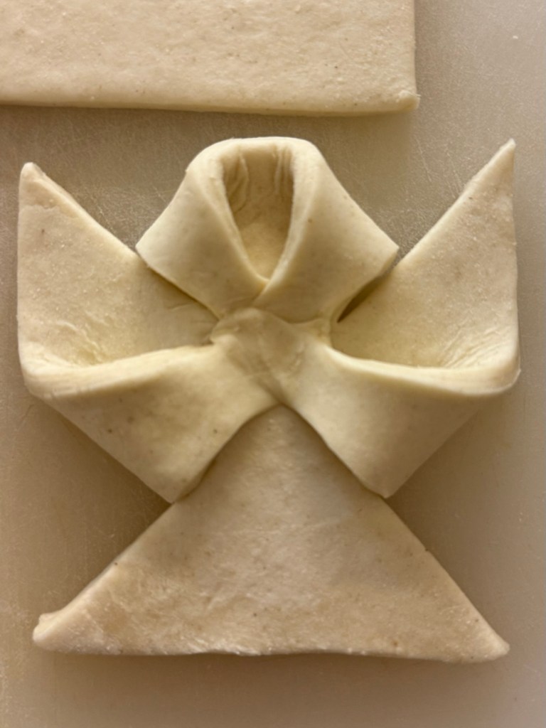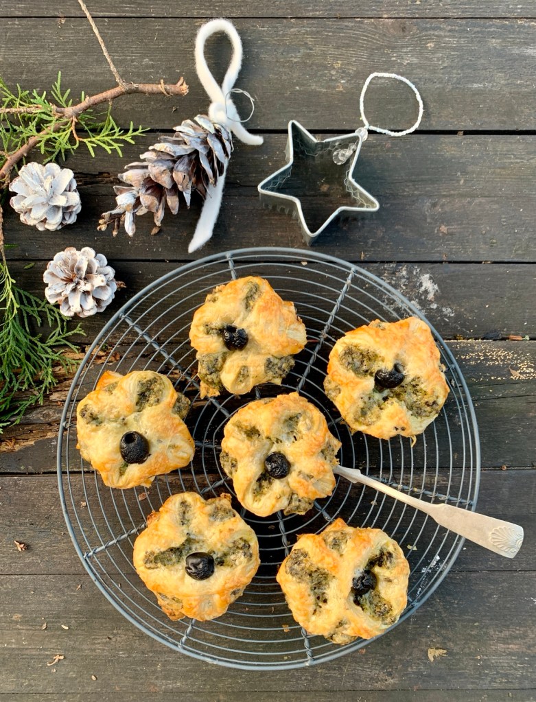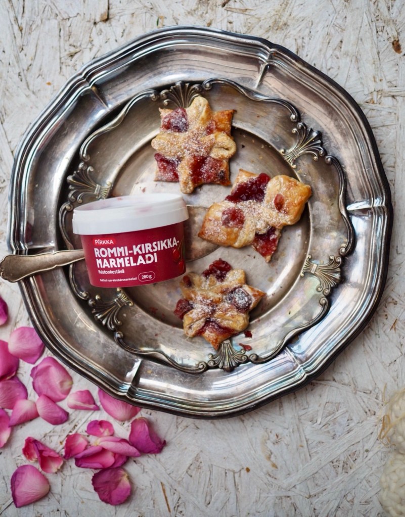 neliöiden kulmiin vinot viillot kohti tortun keskustaa (puoleen väliin). Nosta joka toinenkulma ylös ja nipistä ne keskelle alas painaen suppuun kostutetuin sormin. Laita jokaisen joulutortun keskelle lusikallinen